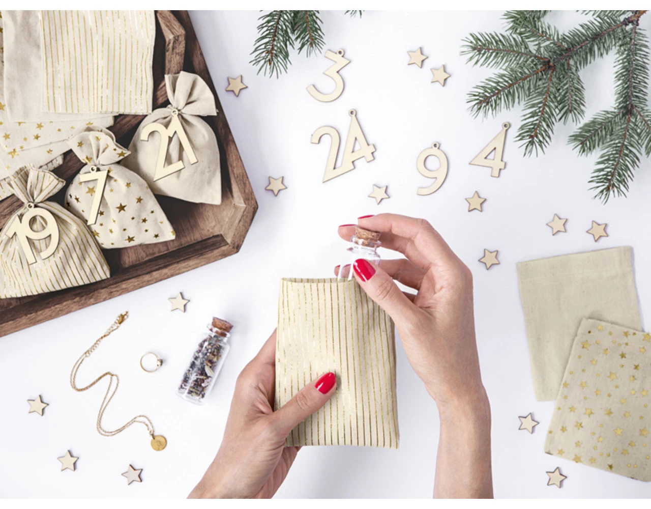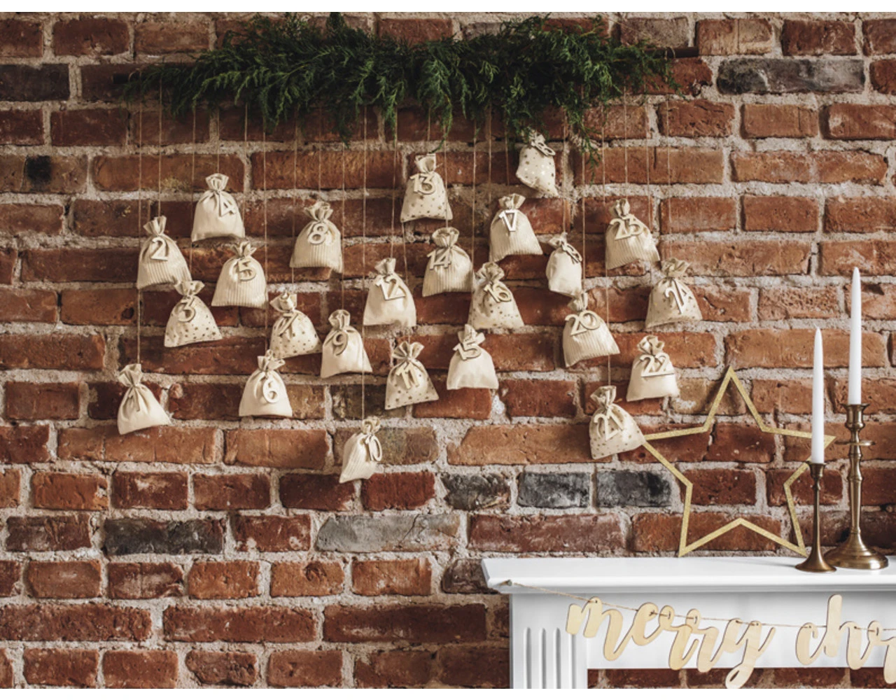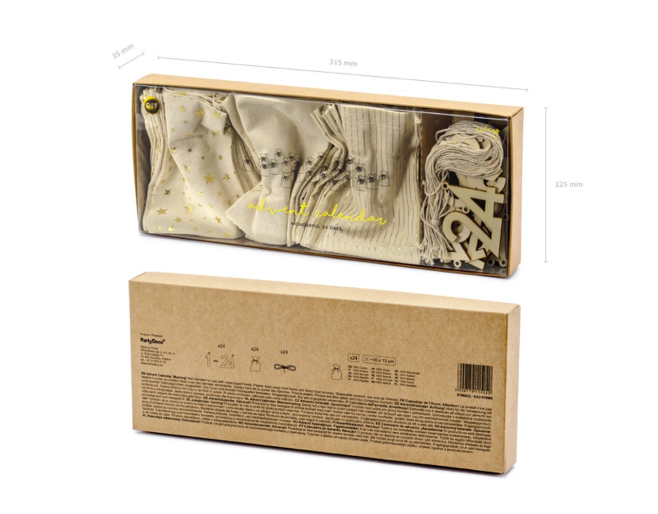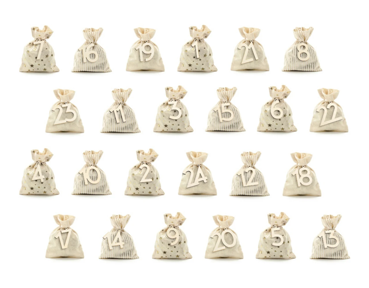 Advent kalender Zakjes, set bestaat uit: 3 designs katoenen zakjes (8 van elk design, afmeting ca. 10 x 13 cm), 24 stuks katoenen koord (lengte ca. 30 cm) en 24 stuks houten cijfers. Product voor zelfmontage.