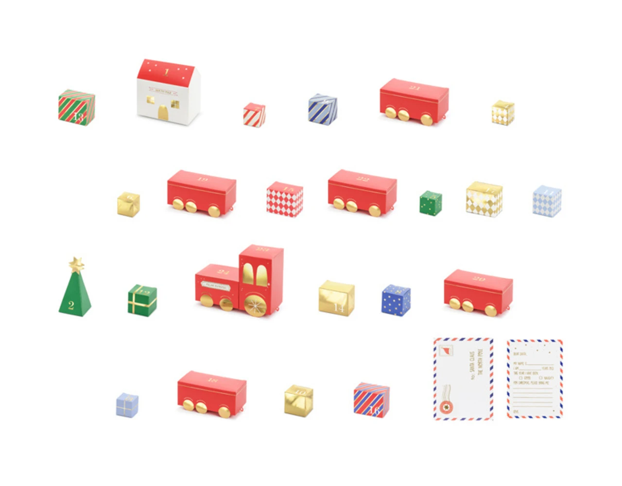 Adventskalender Trein, set bestaat uit: 24 doosjes met kleurrijke en goudmetallic opdruk, ca. 50 cm goudkoord, brief aan de Kerstman met enveloppe en gebruiksaanwijzing. Afmetingen van de doosjes ca. 3,5-13 x 3,5-13 x 3,5-8 cm. Doe het zelf product.