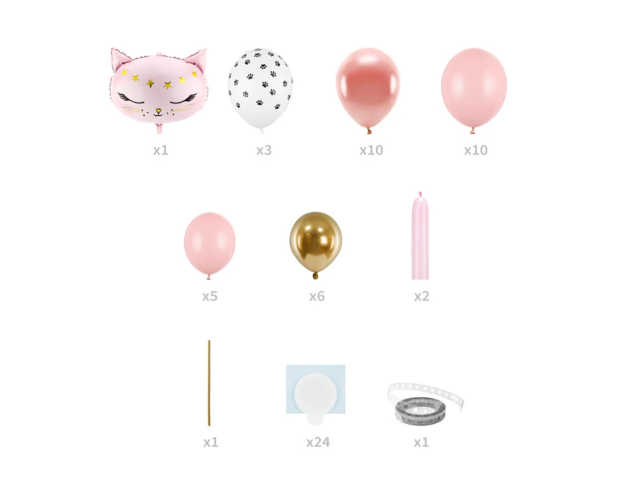 Ballonboeket Kat in roze kleur, set bevat: ballonnen (34 stuks), folieballon (1 stuk), modelleerballonnen (2 stuks), papieren rietje (1 stuk), foamtape (24 stuks) en 2,5 m ballonslingerband. Afmeting ca. 83 x 140 cm.