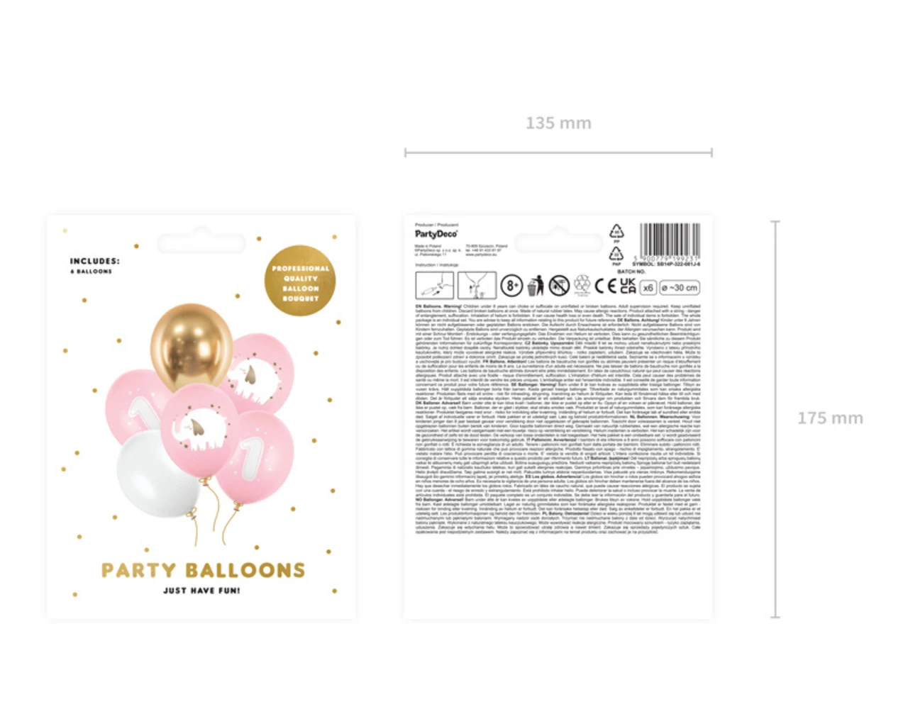 Sterke ballonnen Een jaar met opdruk, set bevat 6 ballonnen (2 in pastel Baby roze kleur met kleurrijke opdruk, 2 in pastel Baby roze kleur met witte opdruk, 1 in pastel Pure White kleur en 1 in Glossy goud kleur), diameter ca. 30 cm.