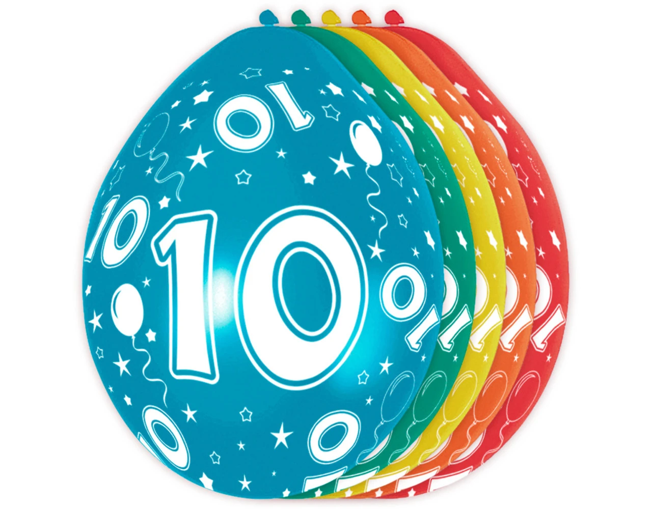 10 Jaar Verjaardag Ballonnen 5 stuks. Inhoud: 5 latex ballonnen. Bijvoorbeeld te gebruiken tijdens de volgende feestgelegenheid/feestgelegenheden: verjaardag, kinderfeestje, jubileum. Elke ballon is 12 inch/30 cm. Het artikel is gemaakt van latex.