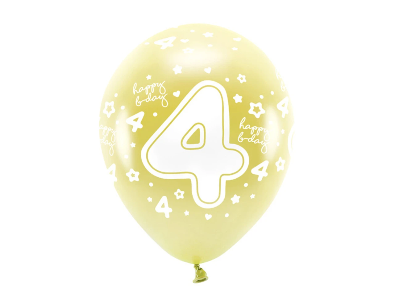 Metallic Eco Ballonnen Nummer ” 4 ” in lichtgouden kleur met witte, vijfzijdige opdruk, diameter ca. 33 cm.