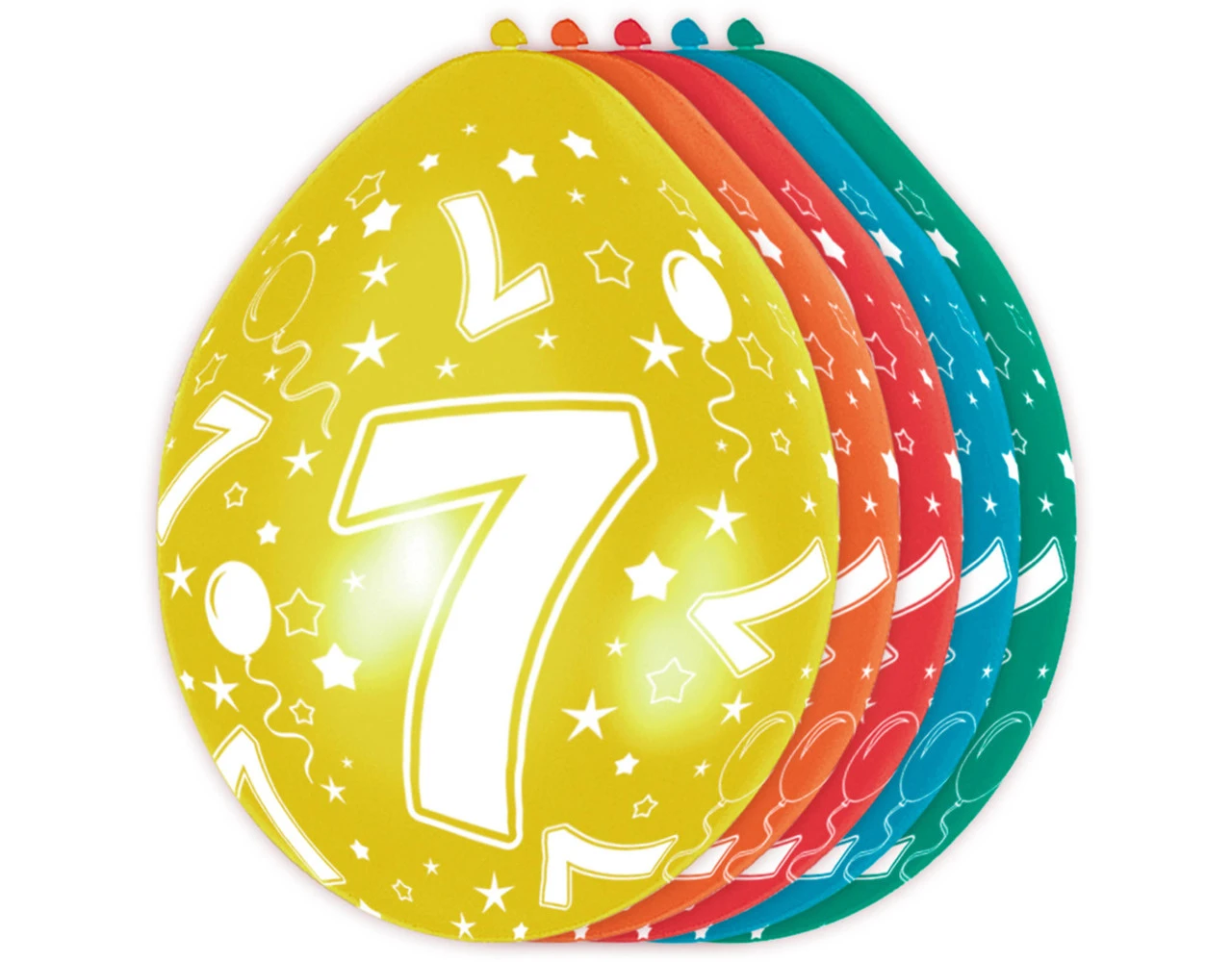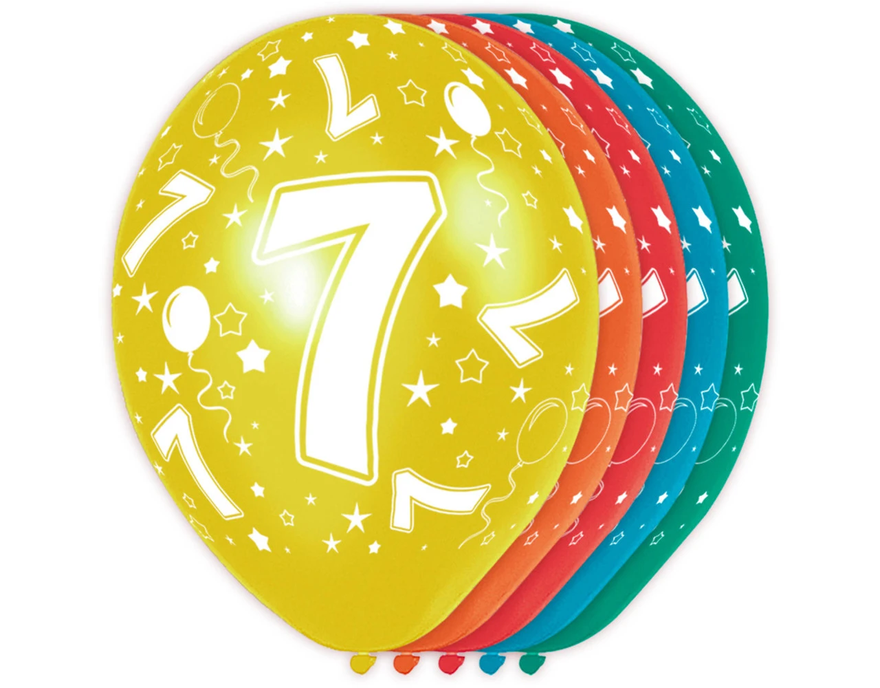 7 Jaar Verjaardag Ballonnen 5 stuks. Inhoud: 5 latex ballonnen. Bijvoorbeeld te gebruiken tijdens de volgende feestgelegenheid/feestgelegenheden: verjaardag, kinderfeestje, jubileum. Elke ballon is 12 inch/30 cm. Het artikel is gemaakt van latex.