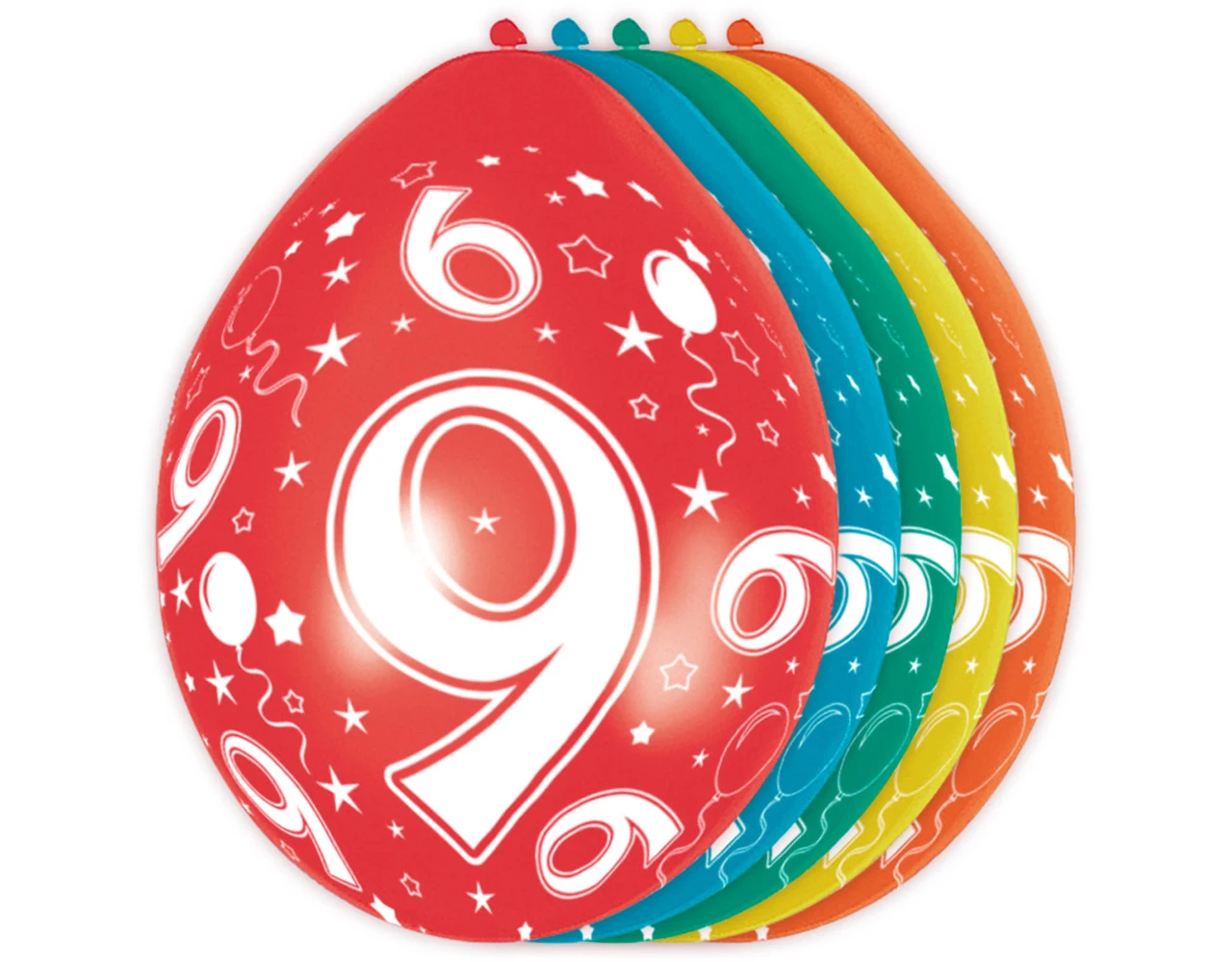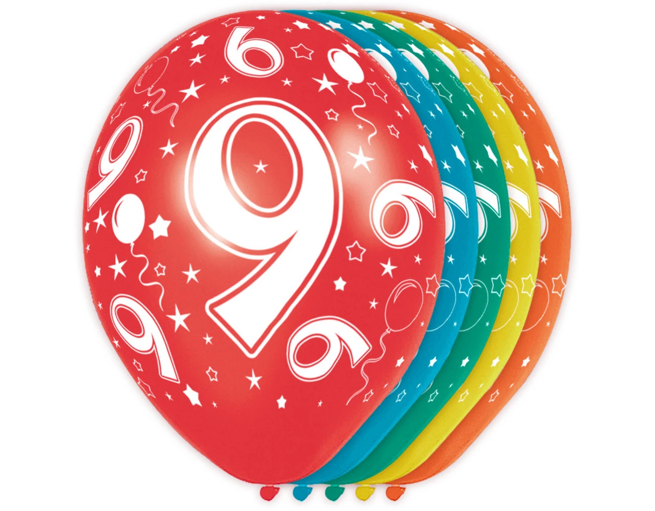 9 Jaar Verjaardag Ballonnen 5 stuks. Inhoud: 5 latex ballonnen. Bijvoorbeeld te gebruiken tijdens de volgende feestgelegenheid/feestgelegenheden: verjaardag, kinderfeestje, jubileum. Elke ballon is 12 inch/30 cm. Het artikel is gemaakt van latex.