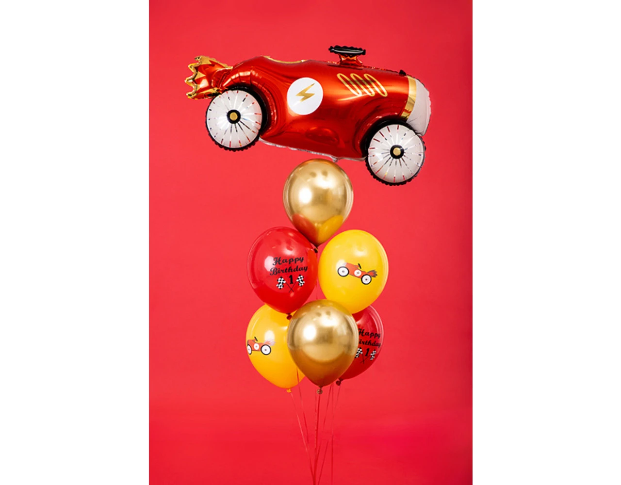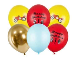 Sterke Ballonnen Happy Birthday, set bestaat uit 6 ballonnen (2 in pastel Honey Yellow kleur met coloful print, 2 in pastel Poppy Red kleur met wit en zwarte print, 1 in pastel Baby Blue kleur en 1 in Glossy gold kleur), diameter ca. 30 cm.