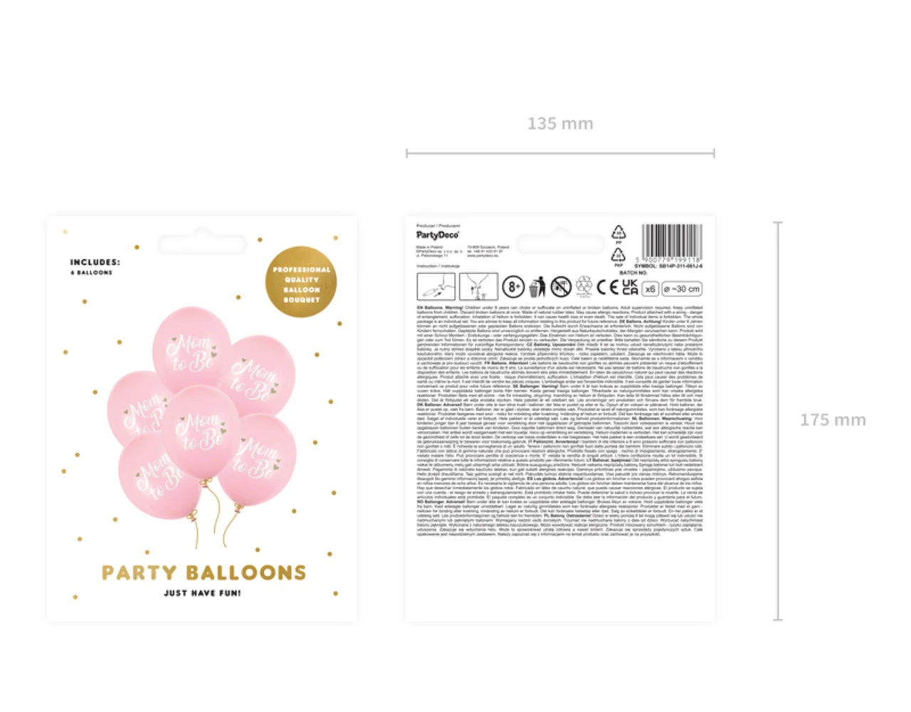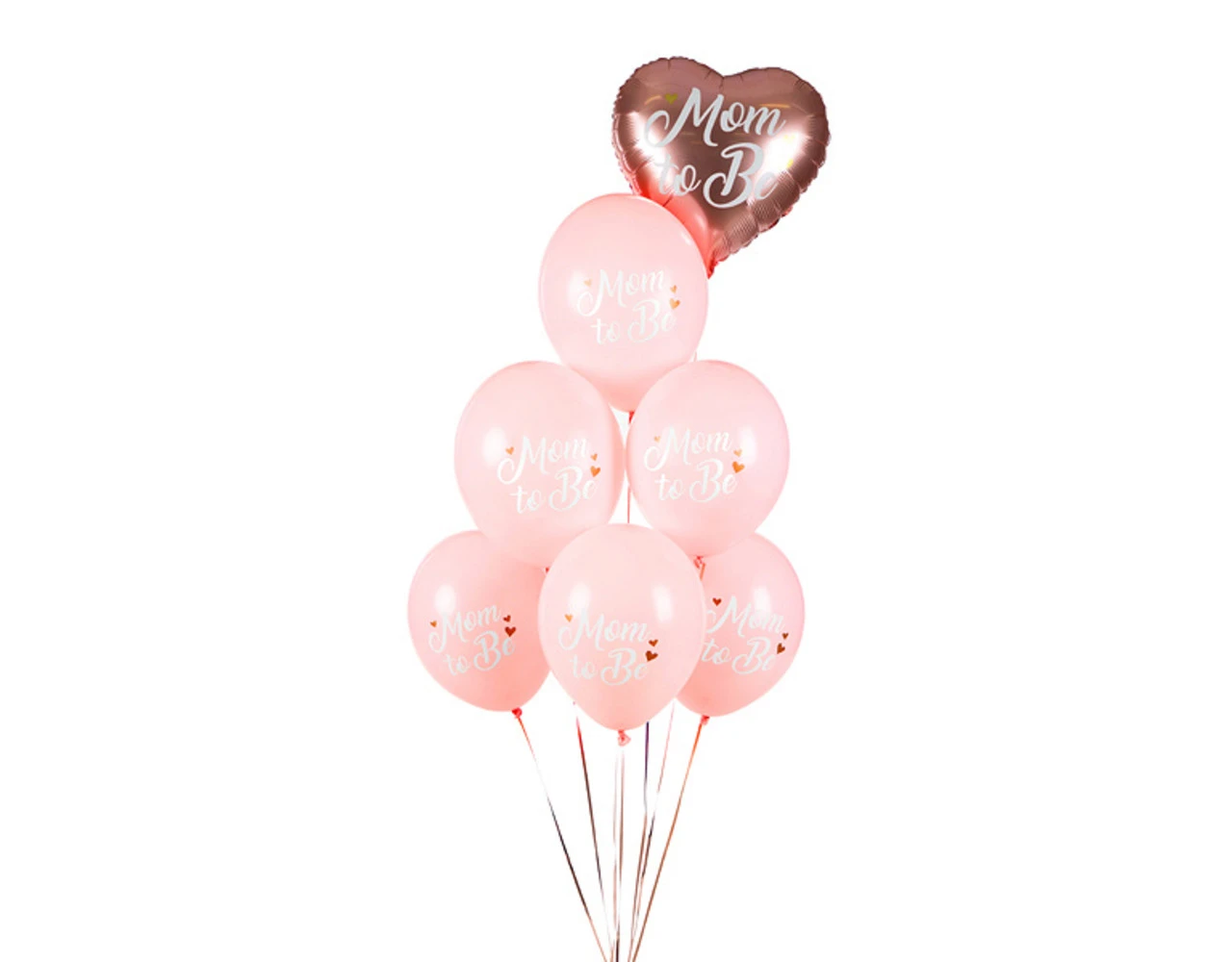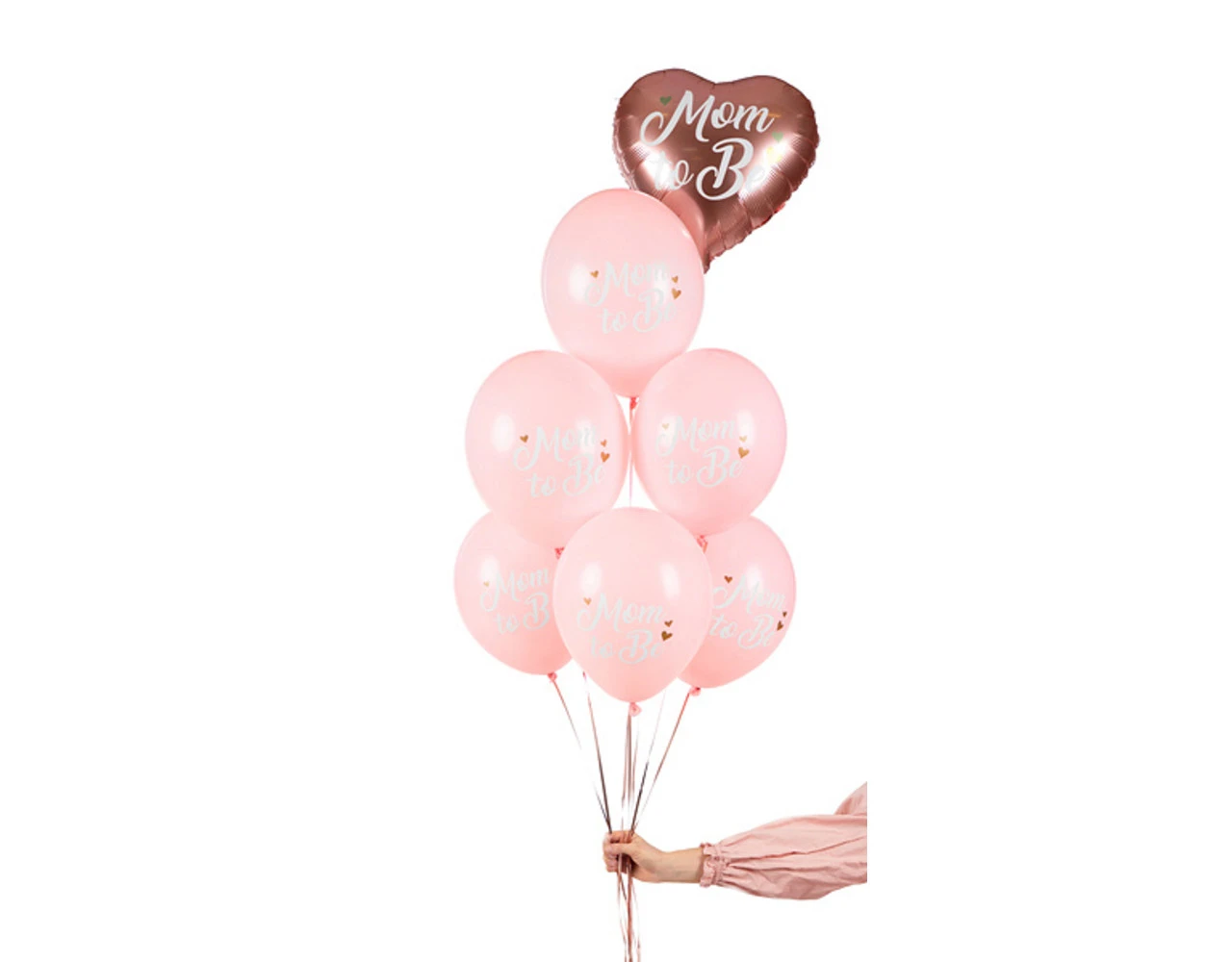 Sterke ballonnen Mom to Be met opdruk, set bevat 6 ballonnen (6 in pastel lichtroze kleur met witte en gouden opdruk), diameter ca. 30 cm.