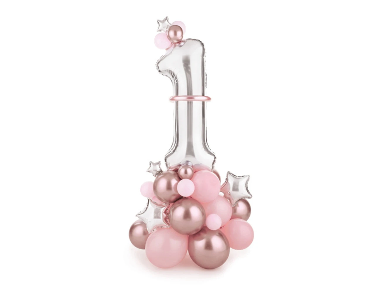 Ballonboeket Nummer ”1” in roze kleur, set bevat: ballonnen (28 stuks), foamtape (10 stuks), modelleerballonnen (5 stuks), papieren rietje (1 stuk), folieballonnen (5 stuks) en 2,5 m ballonnenslingerband. Afmeting ca. 90 x 140 cm.