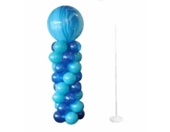 Inhoud: 4 buizen, 3 koppelstukken, 10 ballonringen, houder reuze ballon, ronden voetstandaard (te vullen met water), pin standaard (voor in het gras of zand)