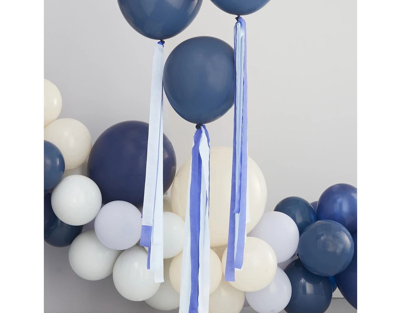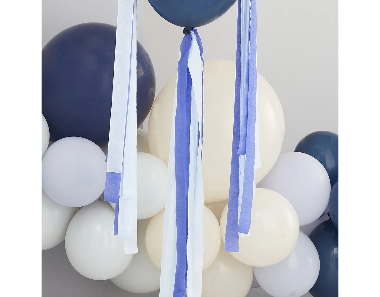 Inhoud: 15 meter streamers, waarvan 8 meter lichtblauw en 7 meter marineblauw, 2 meter garen