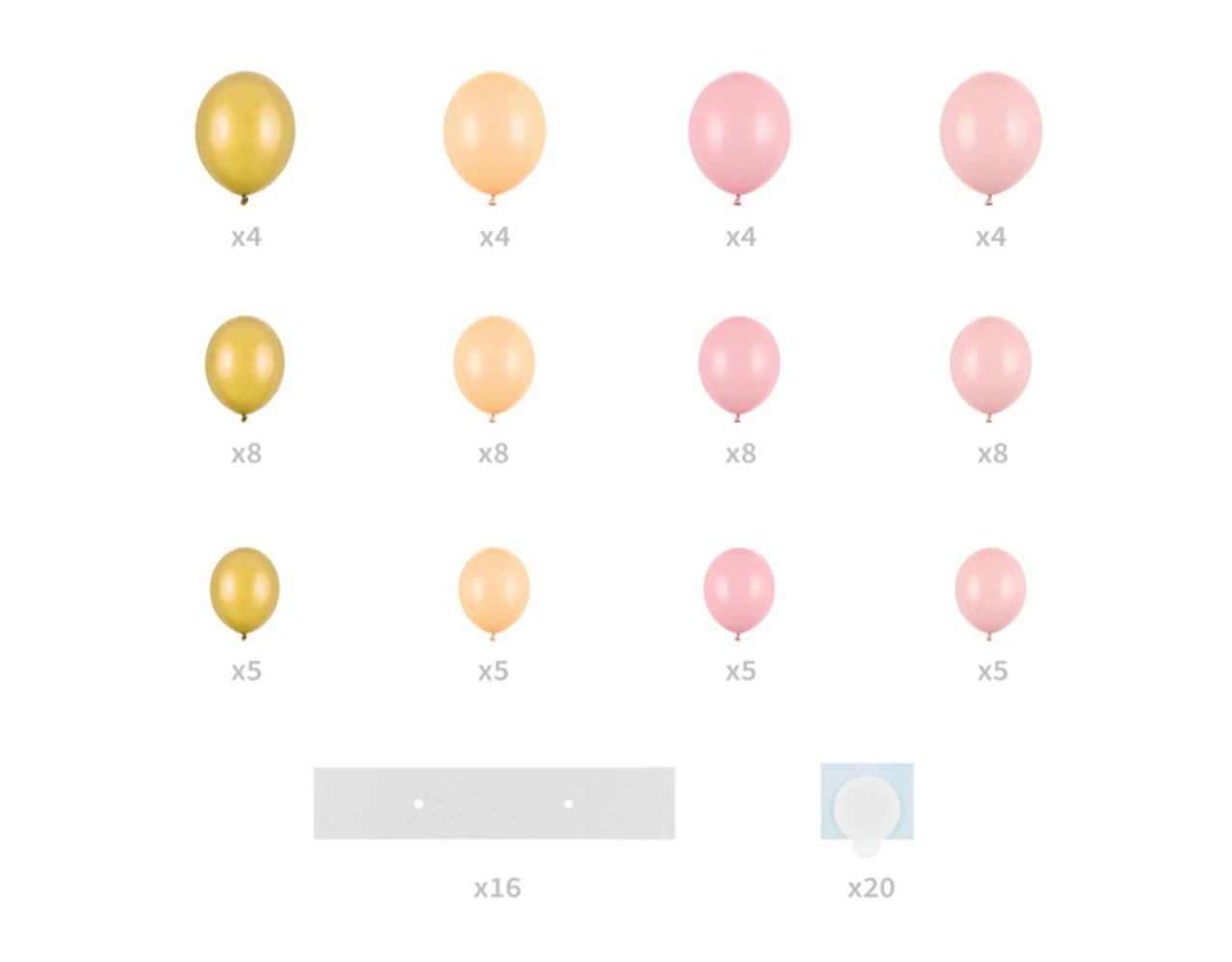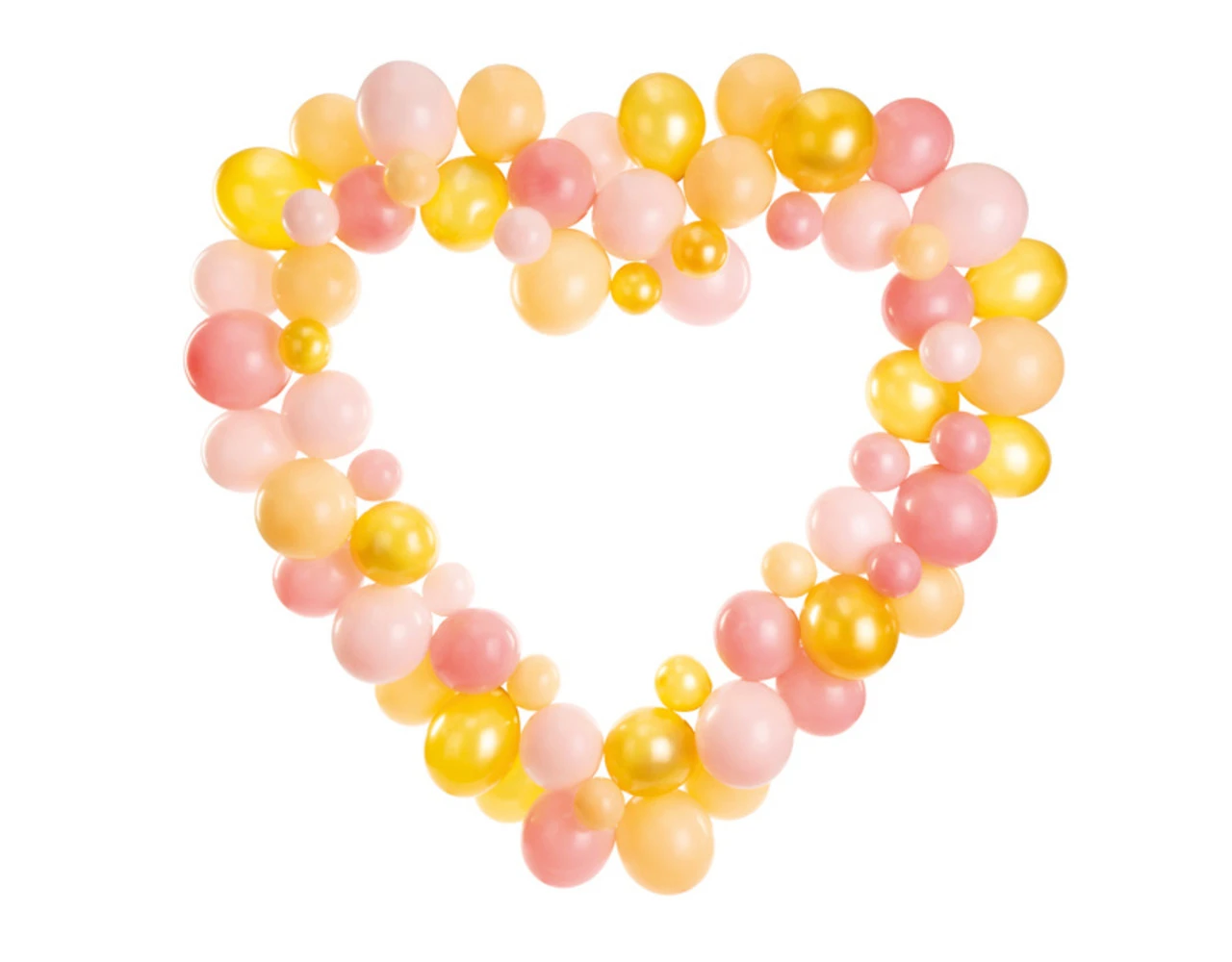 Roze ballonnenslinger met frame Hart, set bevat 68 ballonnen (17 stuks in Pastel Lichtroze kleur, 17 stuks in Pastel Baby Roze kleur, 17 stuks in Pastel Licht Perzik kleur, 17 stuks in Metallic Goud kleur), 16 kartonnen elementen, 20 stuks dubbelzijdige lijmstickers, instructie. Afmeting na vouwen ca. 166 x 160 cm.