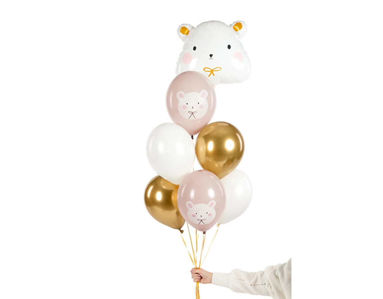 Sterke ballonnen Polar Bear met print, set bevat 6 ballonnen (2 in pastel Warm Grey kleur met kleurrijke print, 2 in pastel Pure White kleur en 2 in Glossy gold kleur), diameter ca. 30 cm.