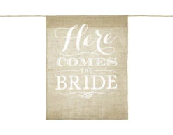 Gangpadbordje van jute, met wit opschrift Here comes the bride, afmeting ca. 41 x 51 cm.