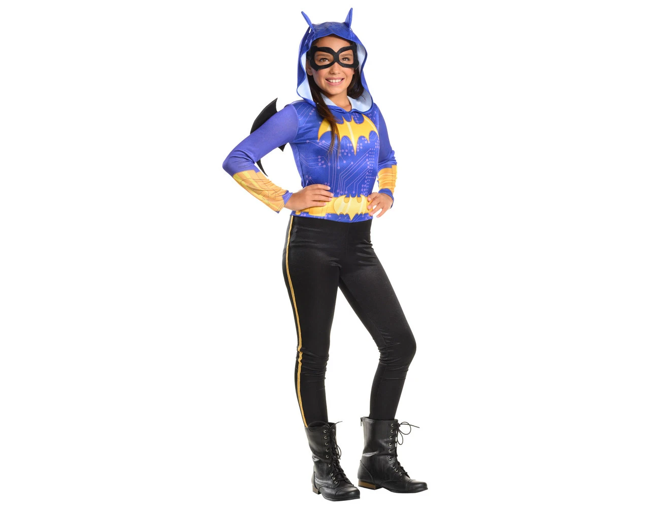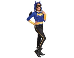 Een van de beroemdste superheldinnen van DC Comics, Batgirl, ook wel bekend als Barbara Gordon, is de dochter van hoofdcommissaris Gordon. Ze schittert in strips, films, tv-series en ook als een van de DC Superhero Girls. Batgirl, een vrouwelijke versie van de beroemde Batman, ze gebruikt haar batarangs en bat-cycle om de misdaad te bestrijden en de straten van Gotham City schoon te maken. Inclusief capuchon jumpsuit met digitaal bedrukt lijfje, 3/4-mouwen, vastgezette vleugels en broek met strepen, gevormd oogmasker met elastische band en klittenbandsluiting, gevormde kaphandschoenen met bedrukte kenmerken en gevormde riem met digitaal gedrukte details en klittenbandsluiting.
