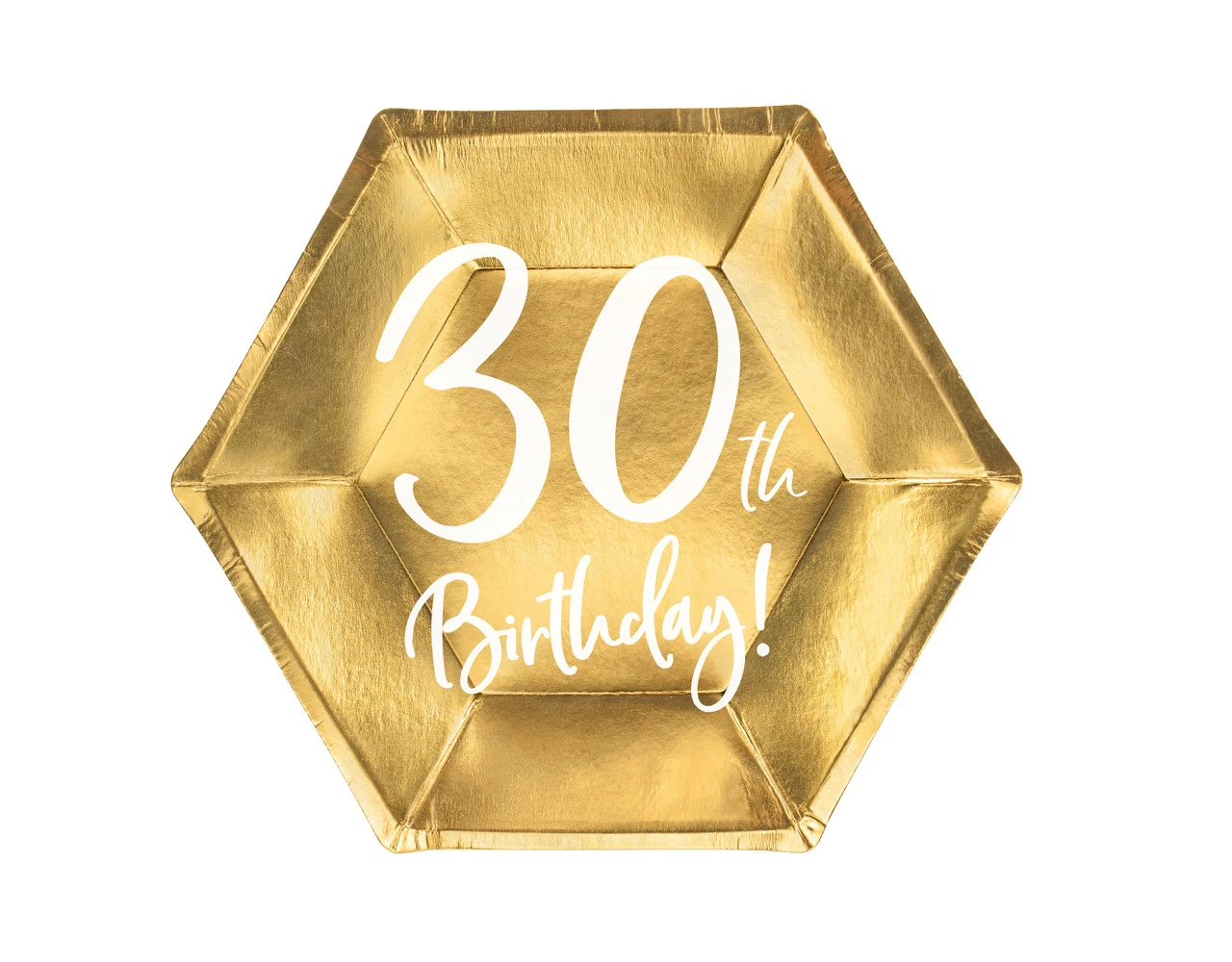 Inhoud: Papieren borden in goud metallic kleur met witte opschrift 30ste !, afm. 20 x 17 cm. (1 PKT / 6 st.)