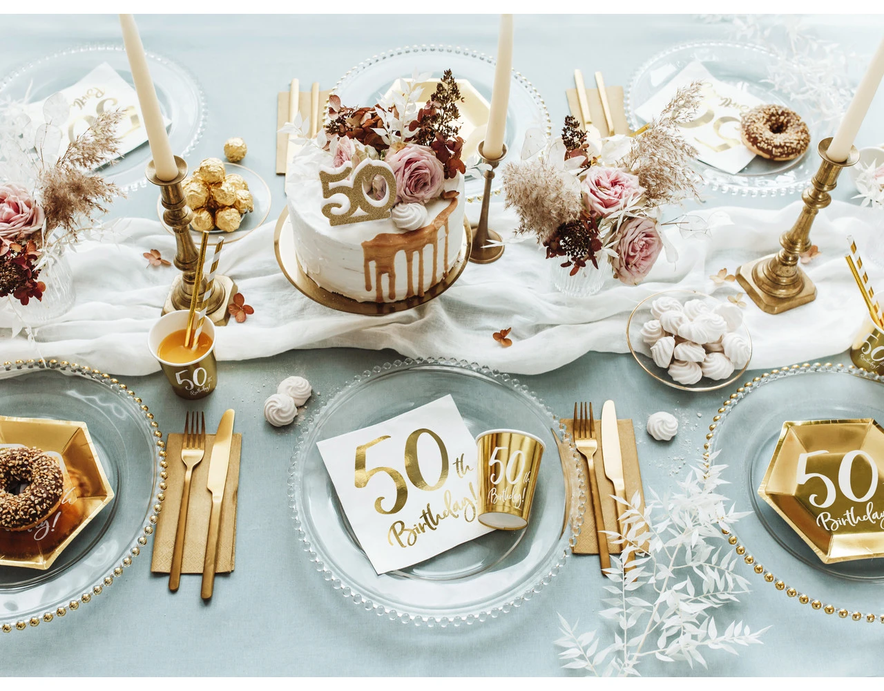 Inhoud: Papieren borden in goud metallic kleur met witte opschrift 50th Birthday !, afm. 20 x 17 cm. (1 PKT / 6 st.)
