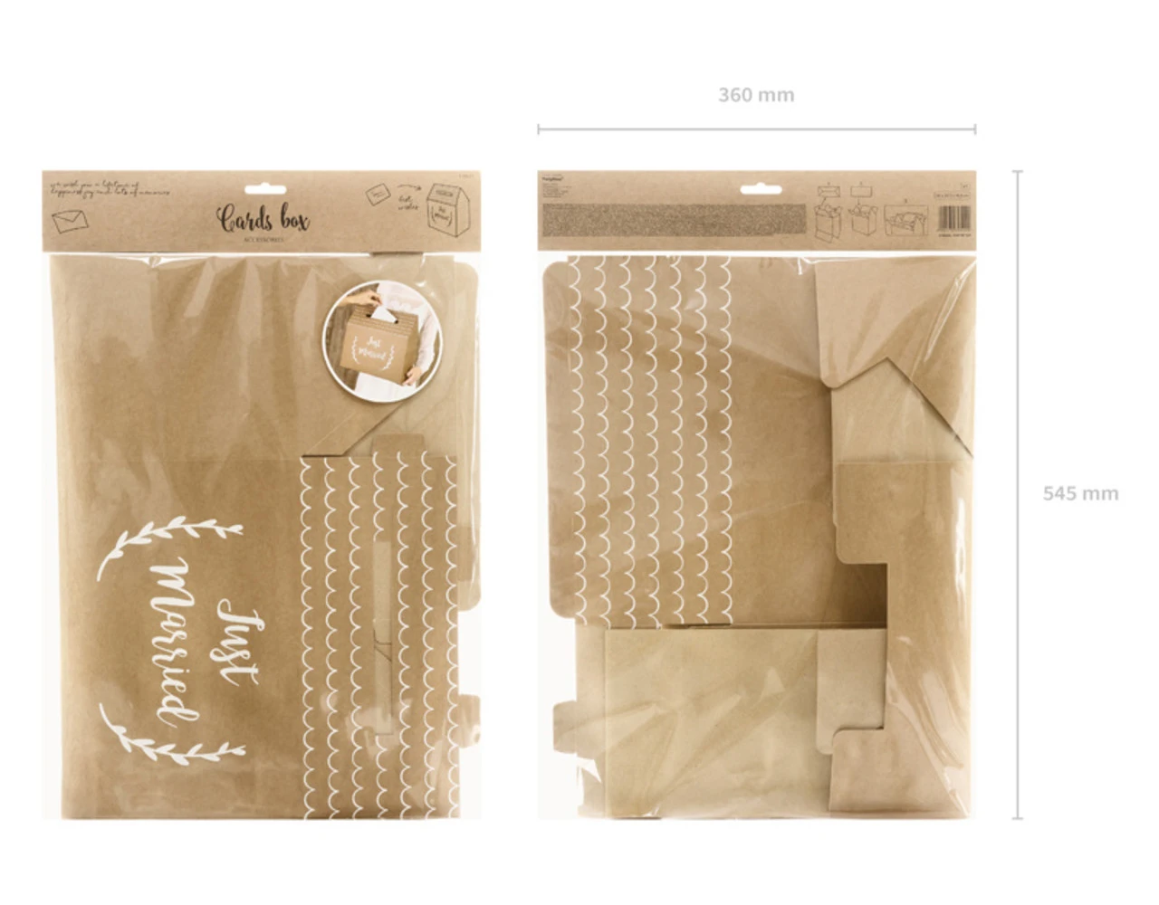 Trouwkaarten doosje van kraft papier met wit opschrift Just Married, afmeting na assemblage ca. 30 x 30,5 x 16,5 cm.