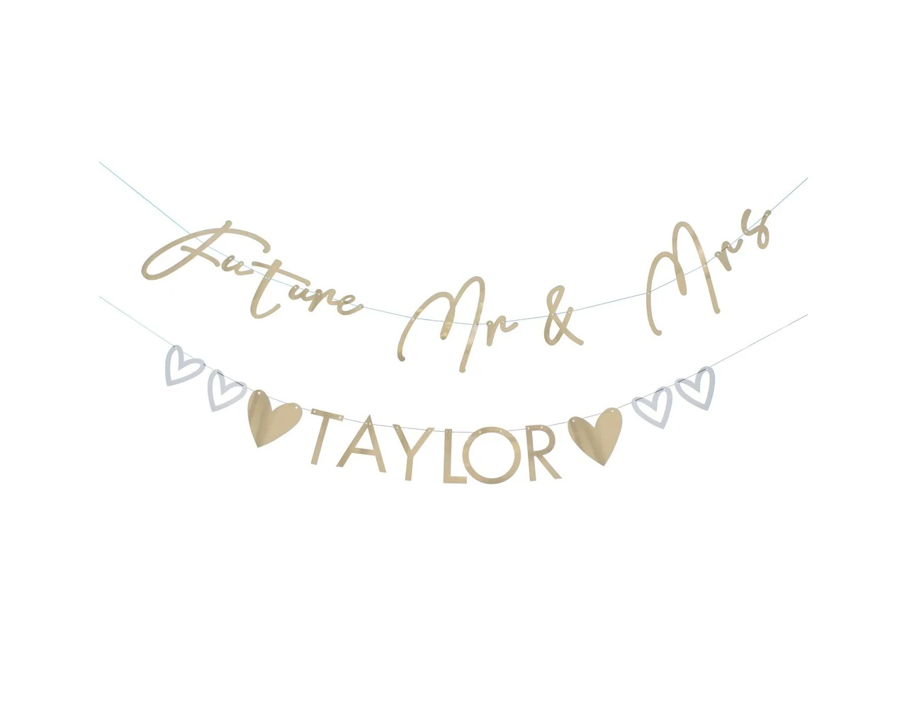 Stijlvol en trendy, deze gouden gepersonaliseerde vlaggenlijn zal uw verlovingsfeest speciaal maken voor u en uw verloofde en zal geliefd zijn bij al uw gasten.