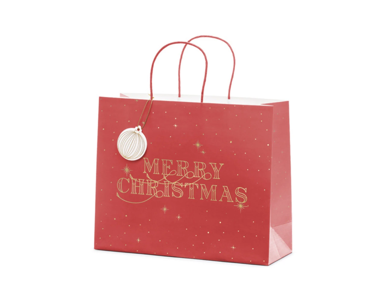 Geschenktas Merry Christmas in dieprode kleur met goud-metallic opdruk, afmeting zonder hengsels ca. 32,5 x 26,5 x 11,5 cm.