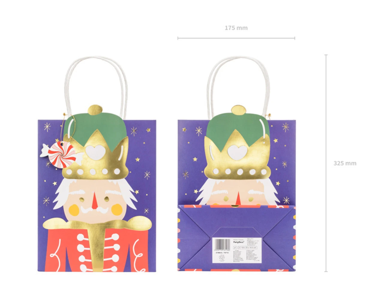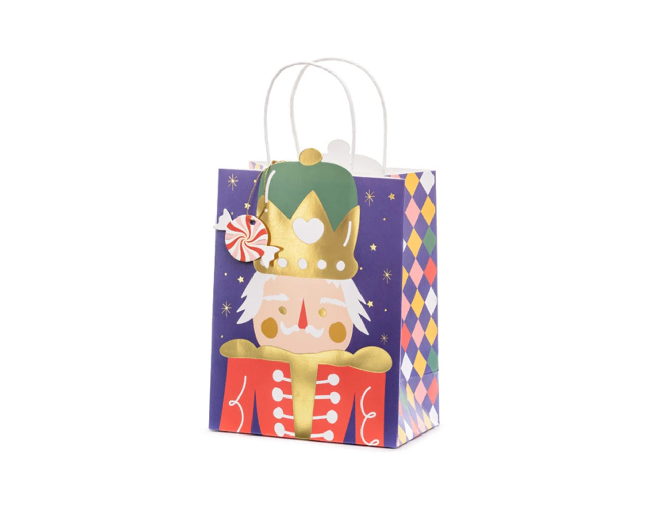 Geschenktas Notenkraker in marineblauwe kleur met kleurrijke en gouden metallic opdruk, afmeting zonder hengsels ca. 18 x 25 x 10,5 cm.