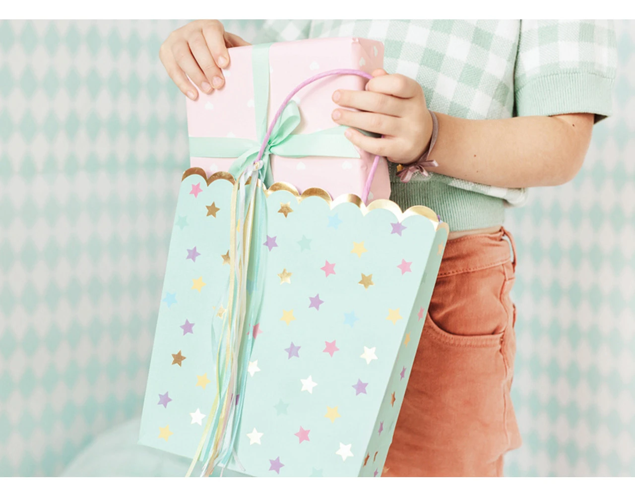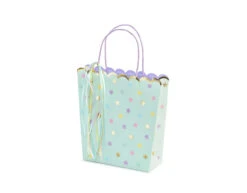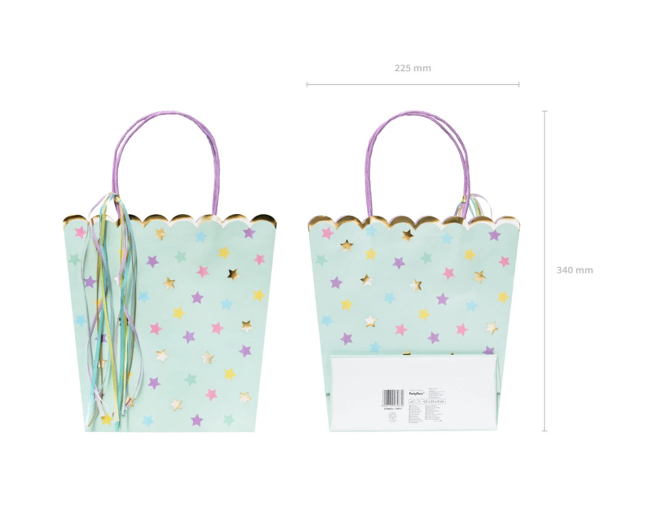 Geschenktasjes in mint kleur met kleurrijke en goud metallic print, kleurrijke linten en print in violet kleur aan de binnenkant van de tasjes, afmeting zonder hengsels ca. 22 x 23 x 8 cm.