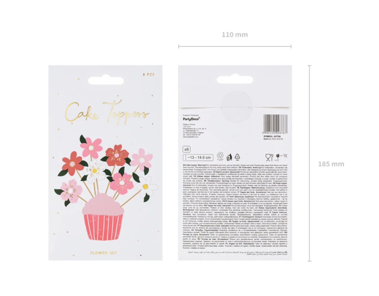 Cake toppers Bloemen, mix van kleuren, set bestaat uit 8 toppers op stokjes, hoogte ca. 13-14,5 cm.