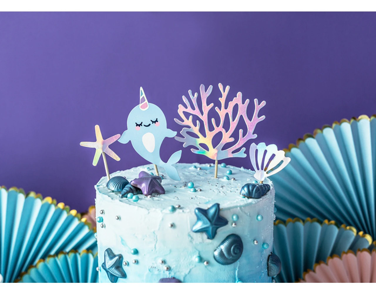 Toppers Narwal, mix van kleuren en dessins, set bevat 4 topper op stokjes, hoogte van ca. 10 cm tot ca. 15,5 cm.