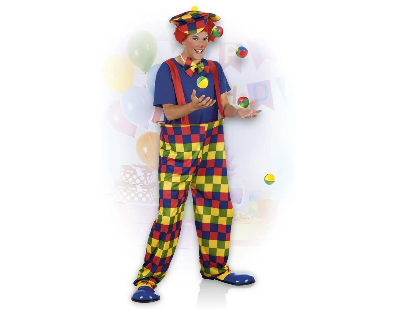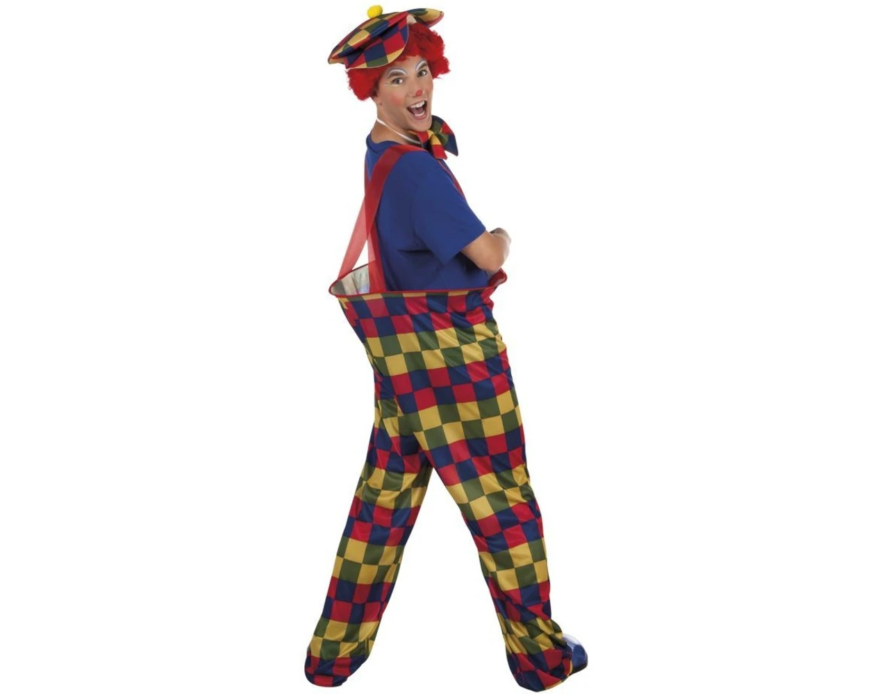 Inhoud: clownsbroek met bretels, strik en pet
