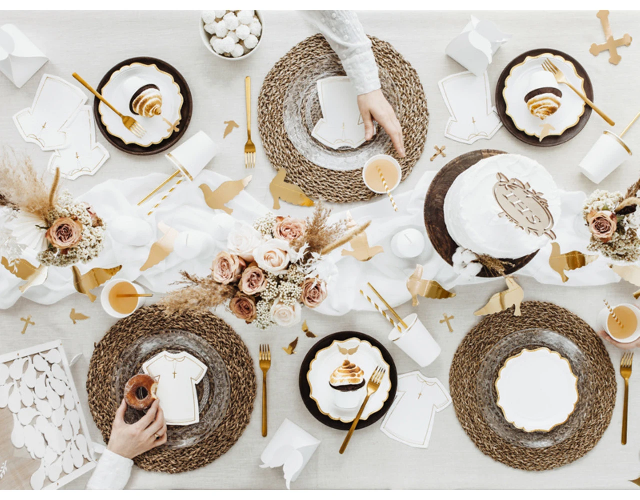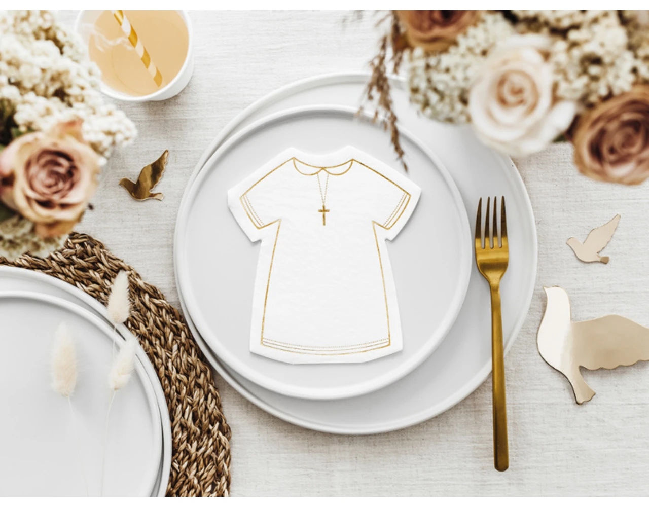 Papieren servetten in de vorm van communie-altaar in witte kleur met metallic goudopdruk, afmeting na uitvouwen ca. 28 x 32 cm, afmeting na vouwen ca. 14 x 16 cm.