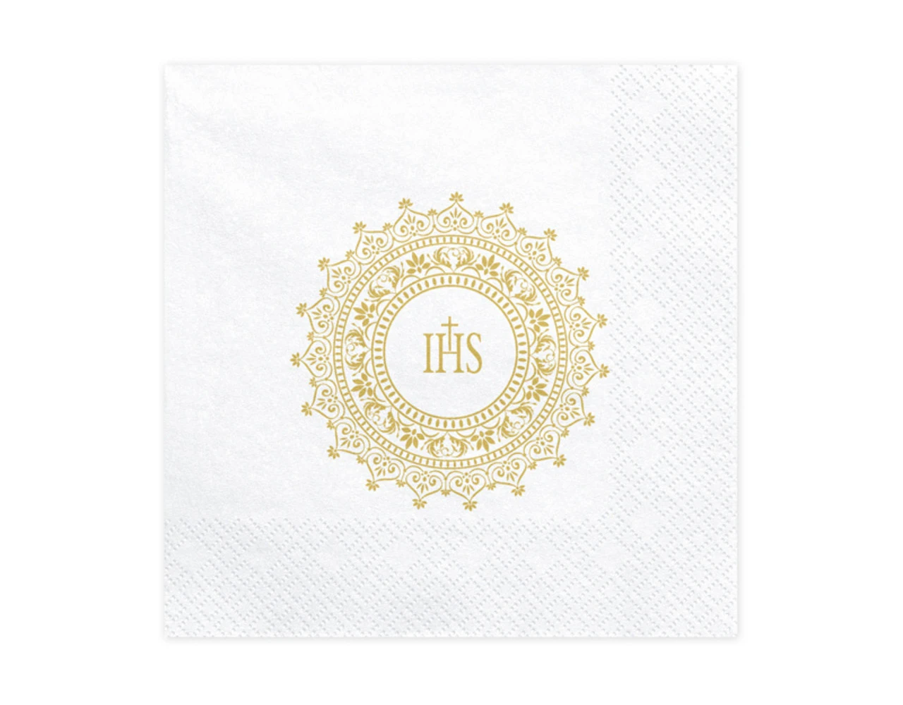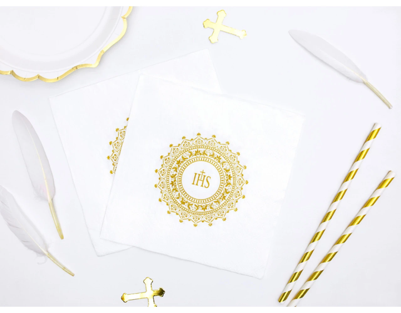 Papieren servetten Eerste Communie, wit met gouden IHS opdruk, formaat na uitvouwen ca. 33 x 33 cm, formaat na assembleren ca. 16,5 x 16,5 cm.