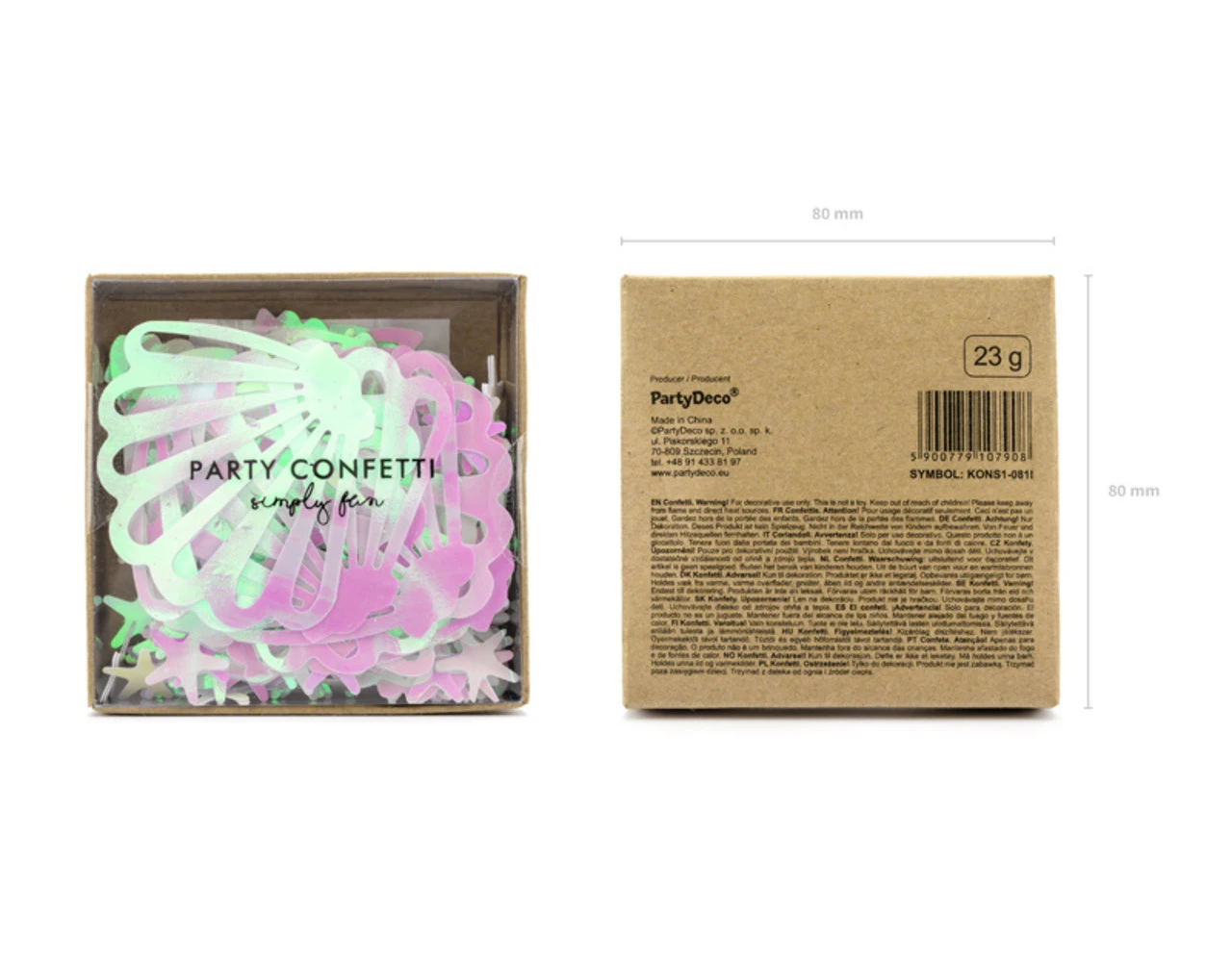 Confetti Narwal in iriserende kleur, set bevat zeeschelpen ( hoogte ca. 2 – 5,5 cm), zeesterren (hoogte ca. 1,5 – 4 cm) en dubbelzijdig plakband (6 stuks). Set bevat ca. 23 g confetti.