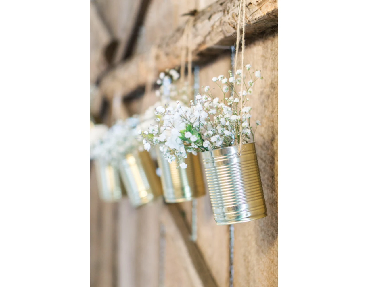 Decoratieve blikken, zilver, gestreept, met jute koord, 10×7 centimeter.