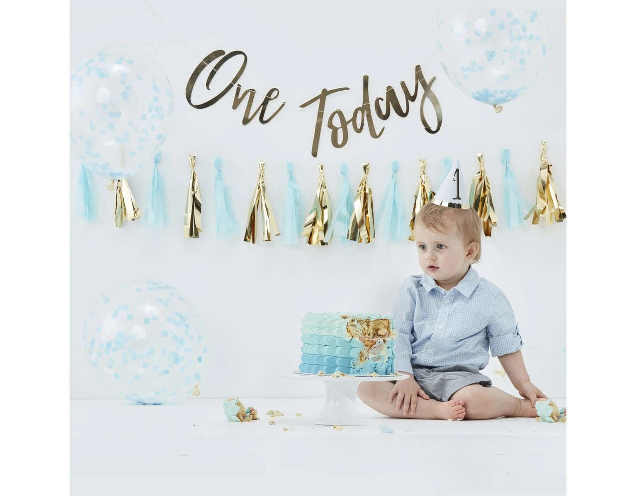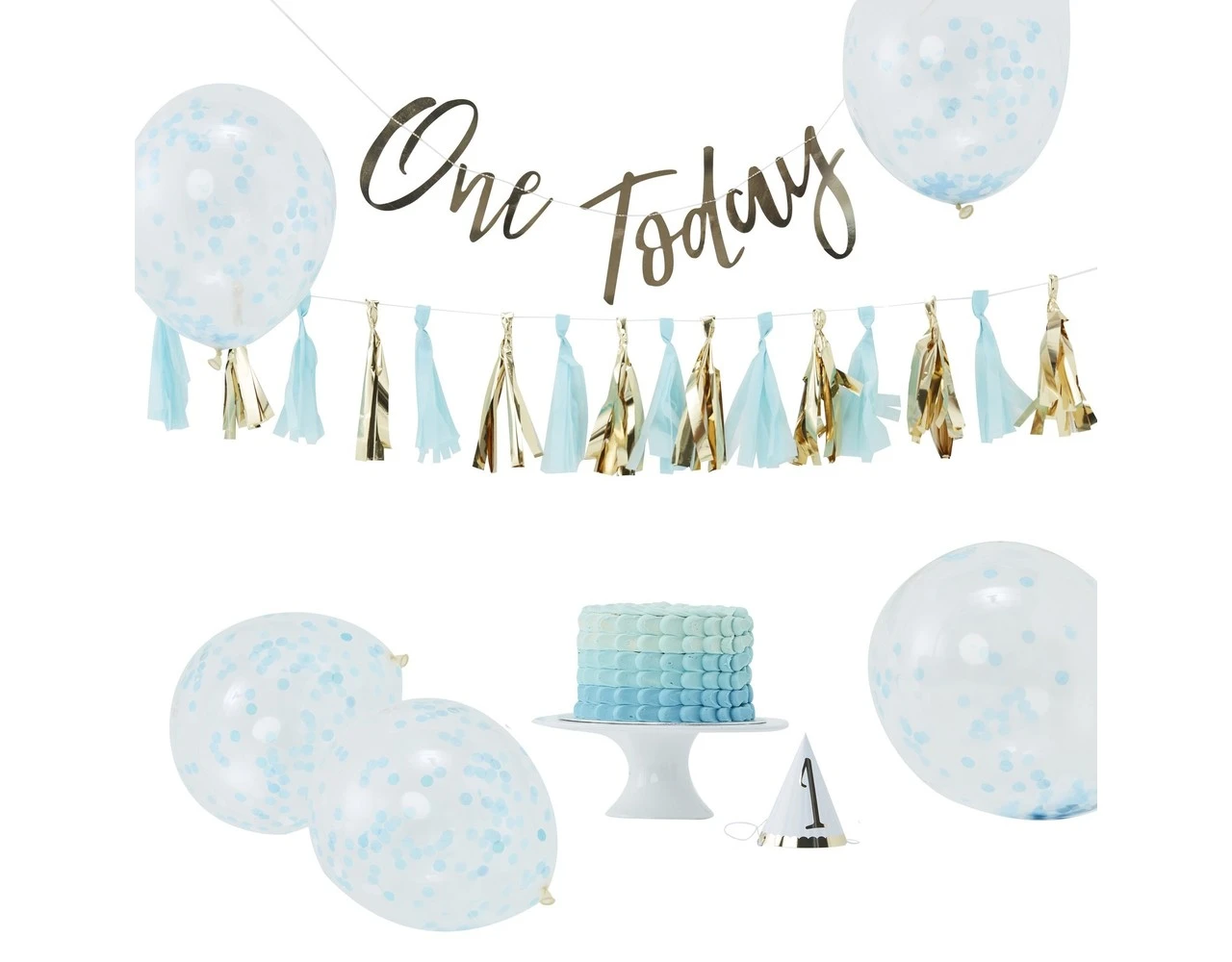 Inhoud: 1 One Today slinger, 1 feesthoedje, 16 tassels voor een tasselslinger en 5x confetti ballonnen. Kleur: blauw/goud