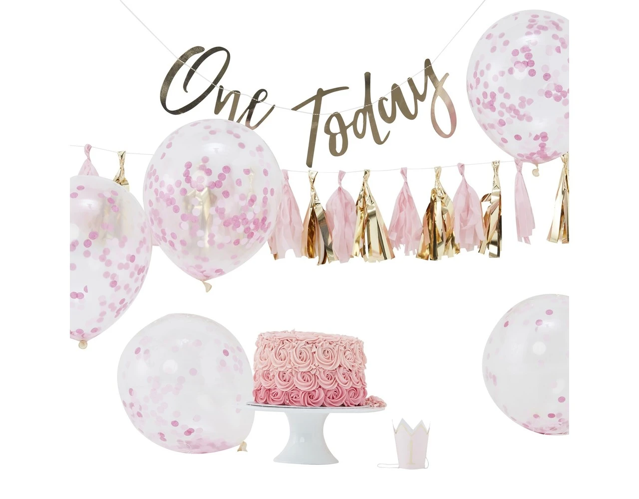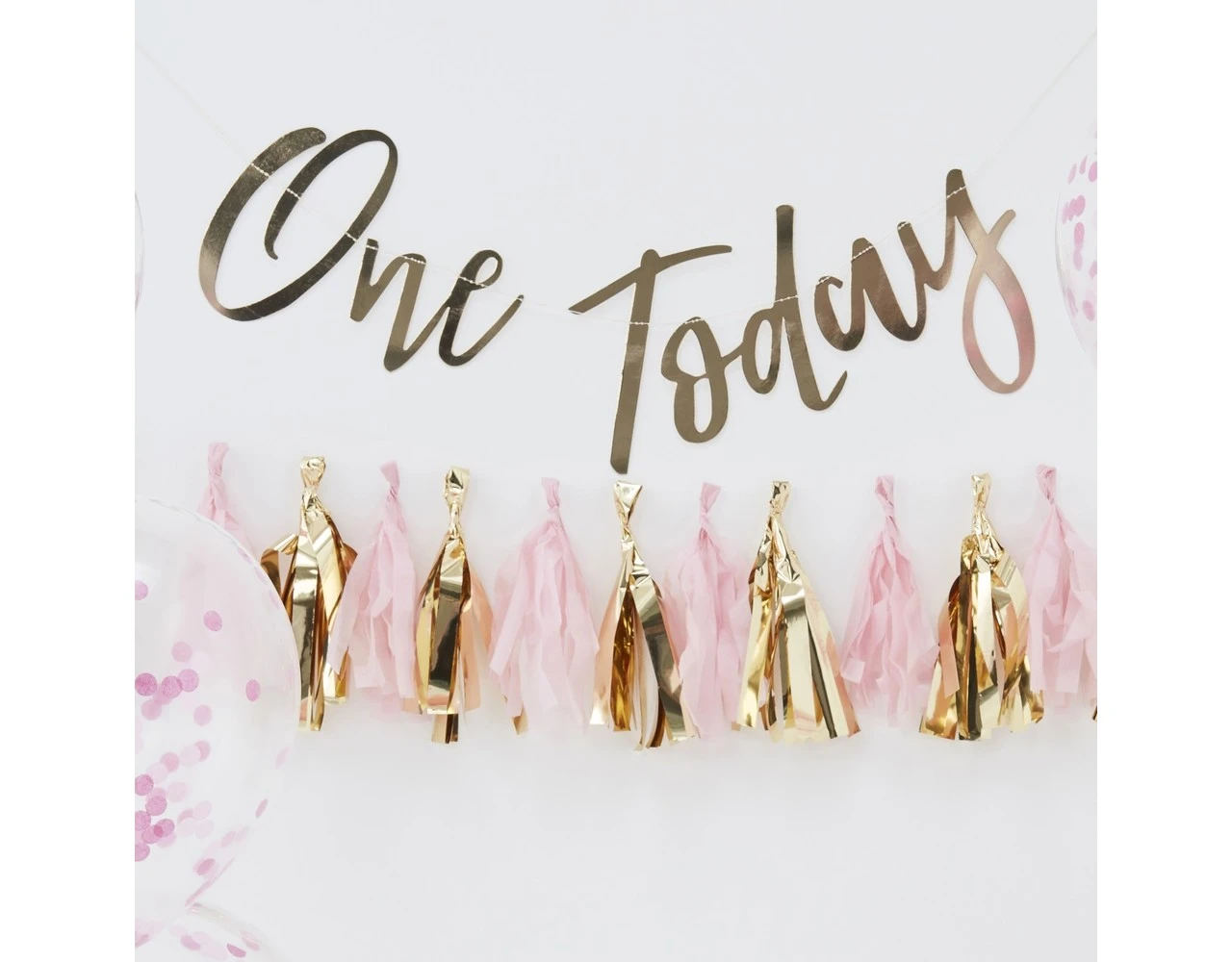 Inhoud: 1 One Today slinger, 1 feesthoedje, 16 tassels voor een tasselslinger en 5x confetti ballonnenKleur: meerkleurig