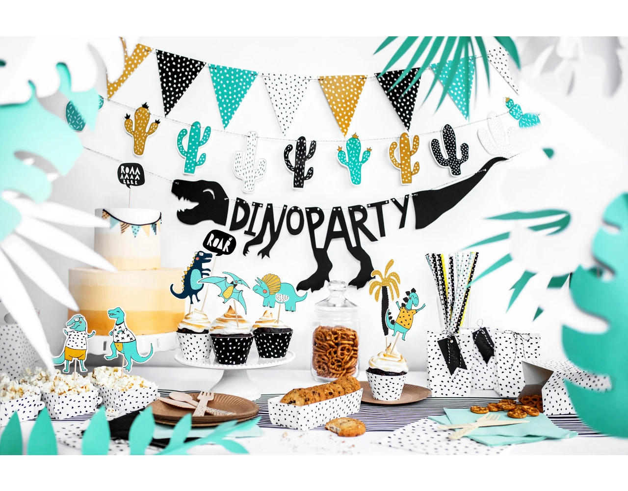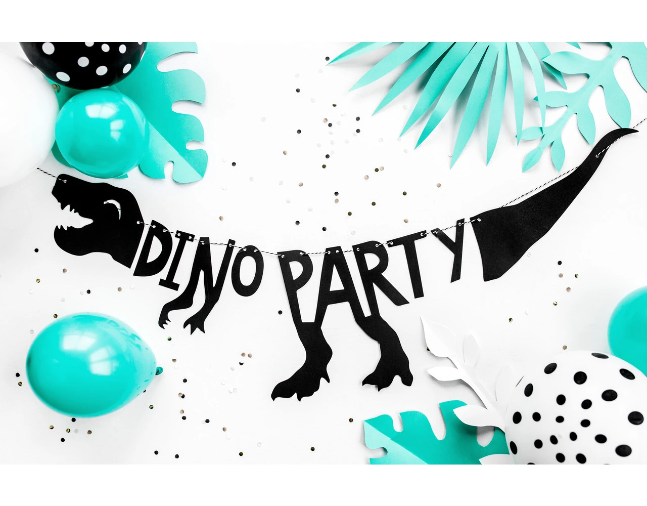 Inhoud: Banner Dinosaurs – Dino Party, gemaakt van zwart papier, doe het zelf, set bevat brieven en ong. 2 m touw, maten na montage: Hoogte ca. 20 cm, lengte ca. 90 cm