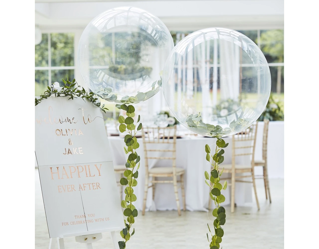 Deze doorzichtige bolballon met bladeren is een eenvoudige manier om een ​​vleugje groen toe te voegen aan uw huwelijksballonnen. De groene wijnstok sluit perfect aan bij een natuurlijk huwelijksthema.