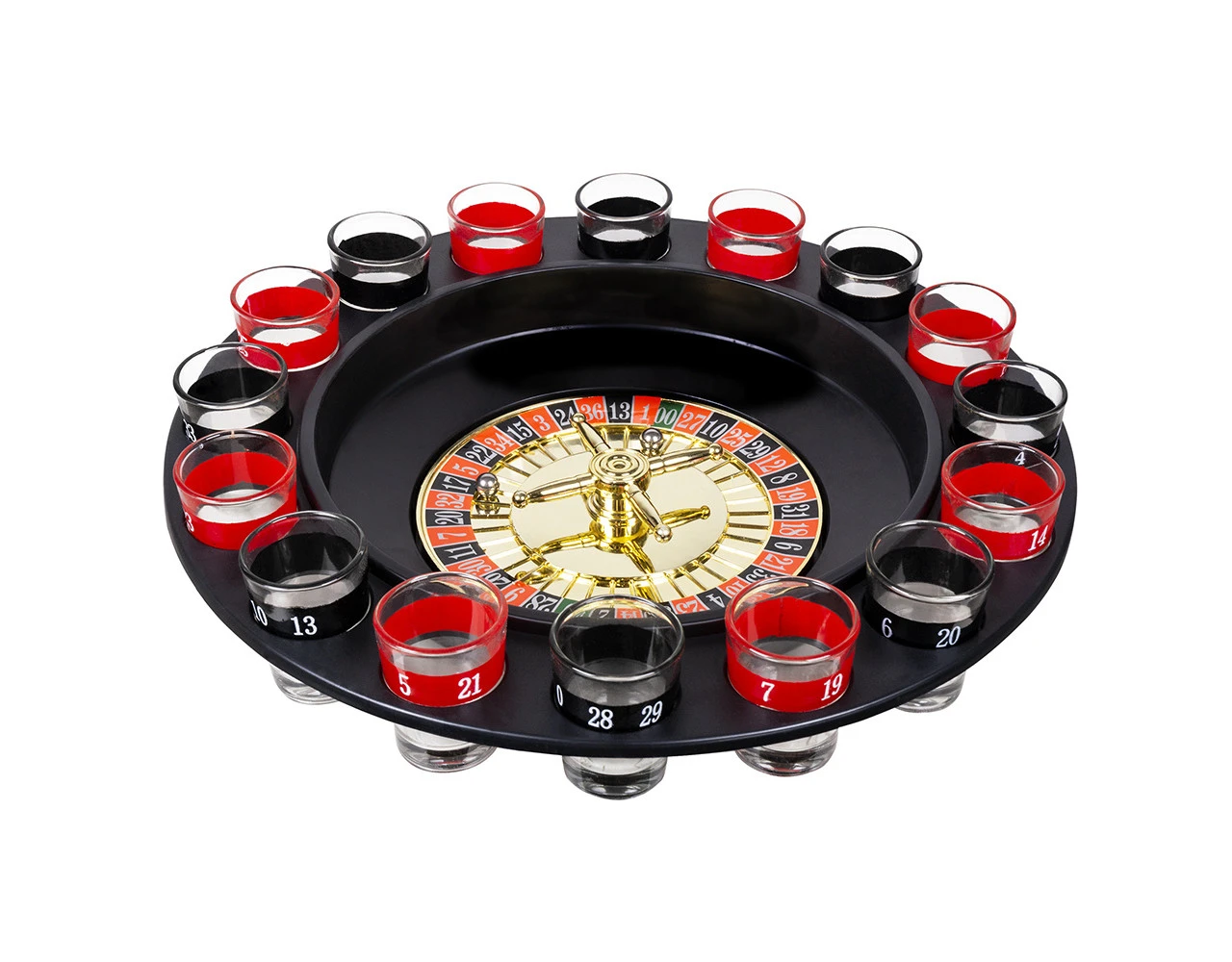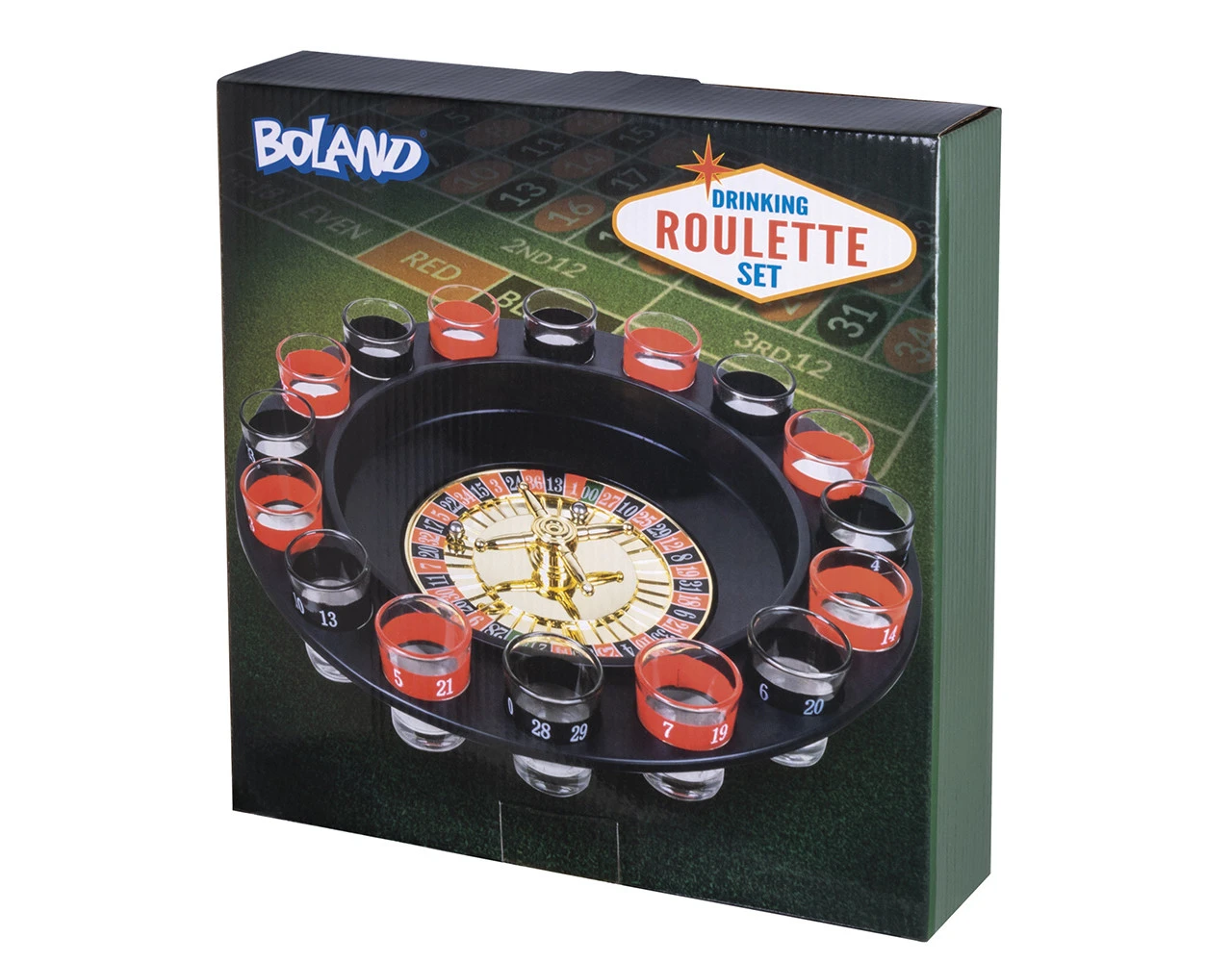 Inhoud: roulette rad, 16 shotglaasjes en 2 balletjes