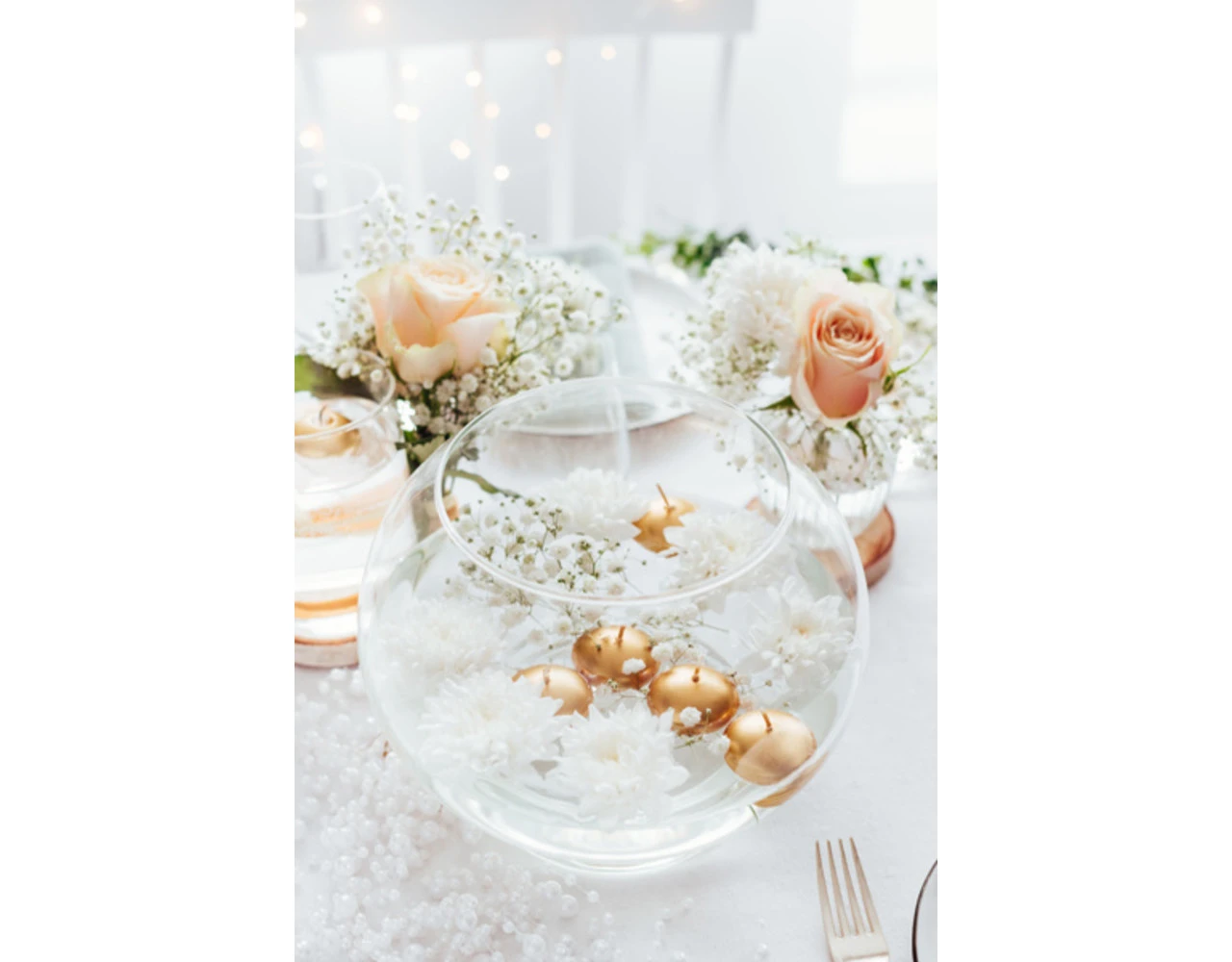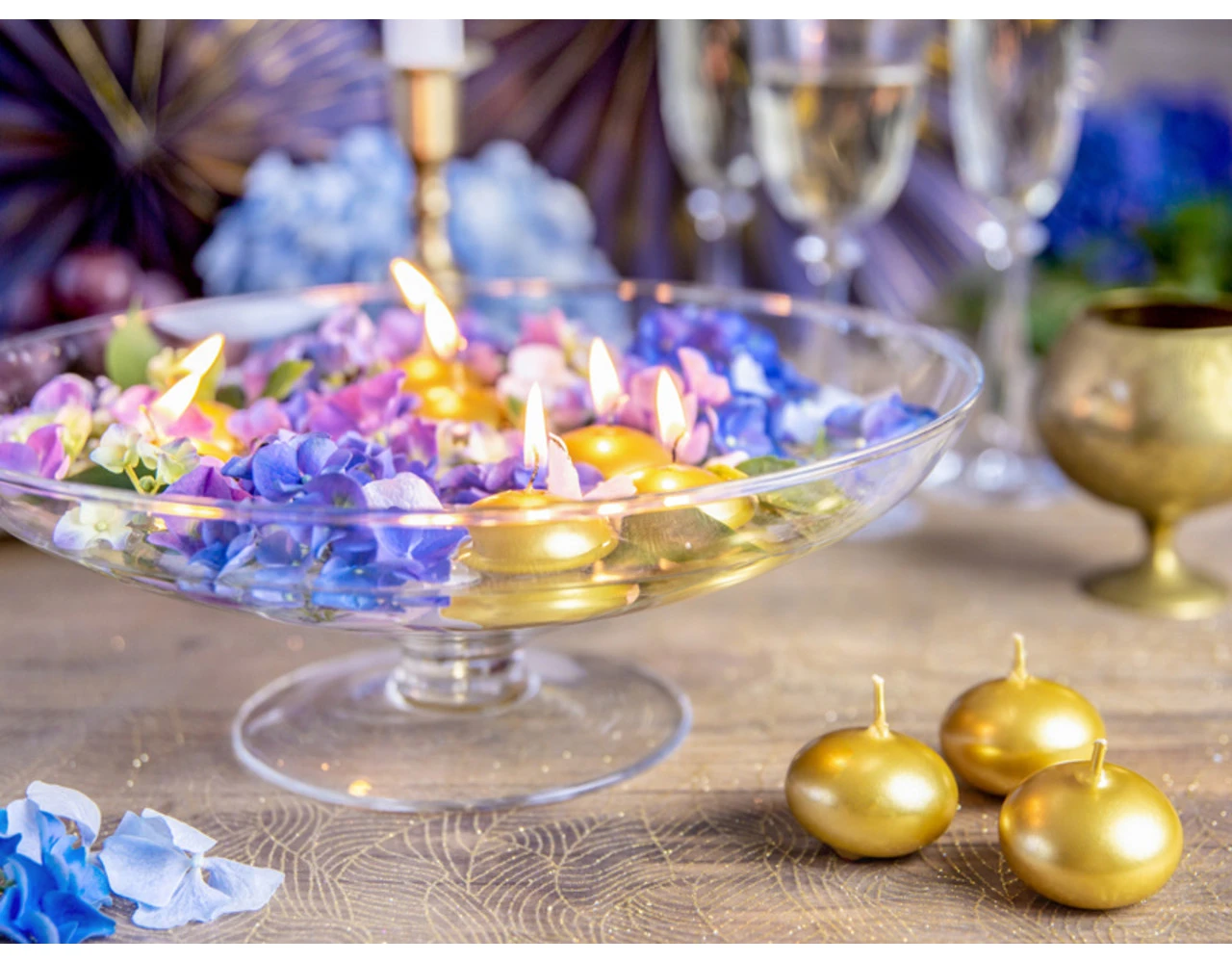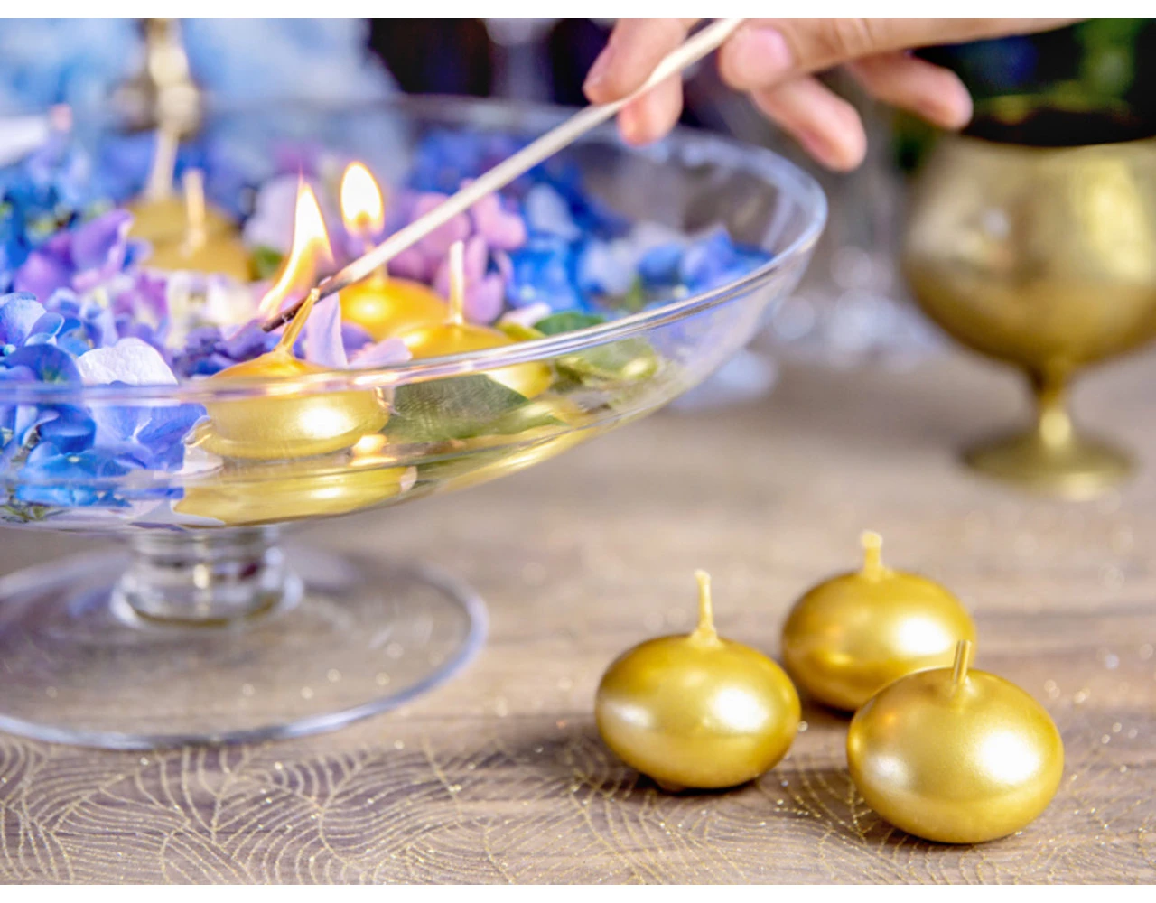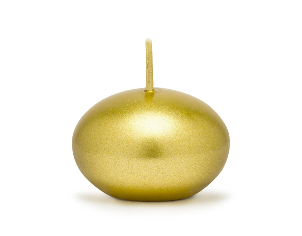 Drijvende kaarsenschijf, metallic, goud, afmeting ca. 4 cm. Brandduur van 1 stuk ca. 2 uur.