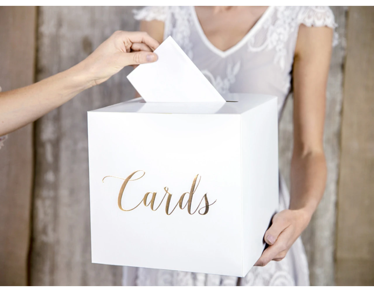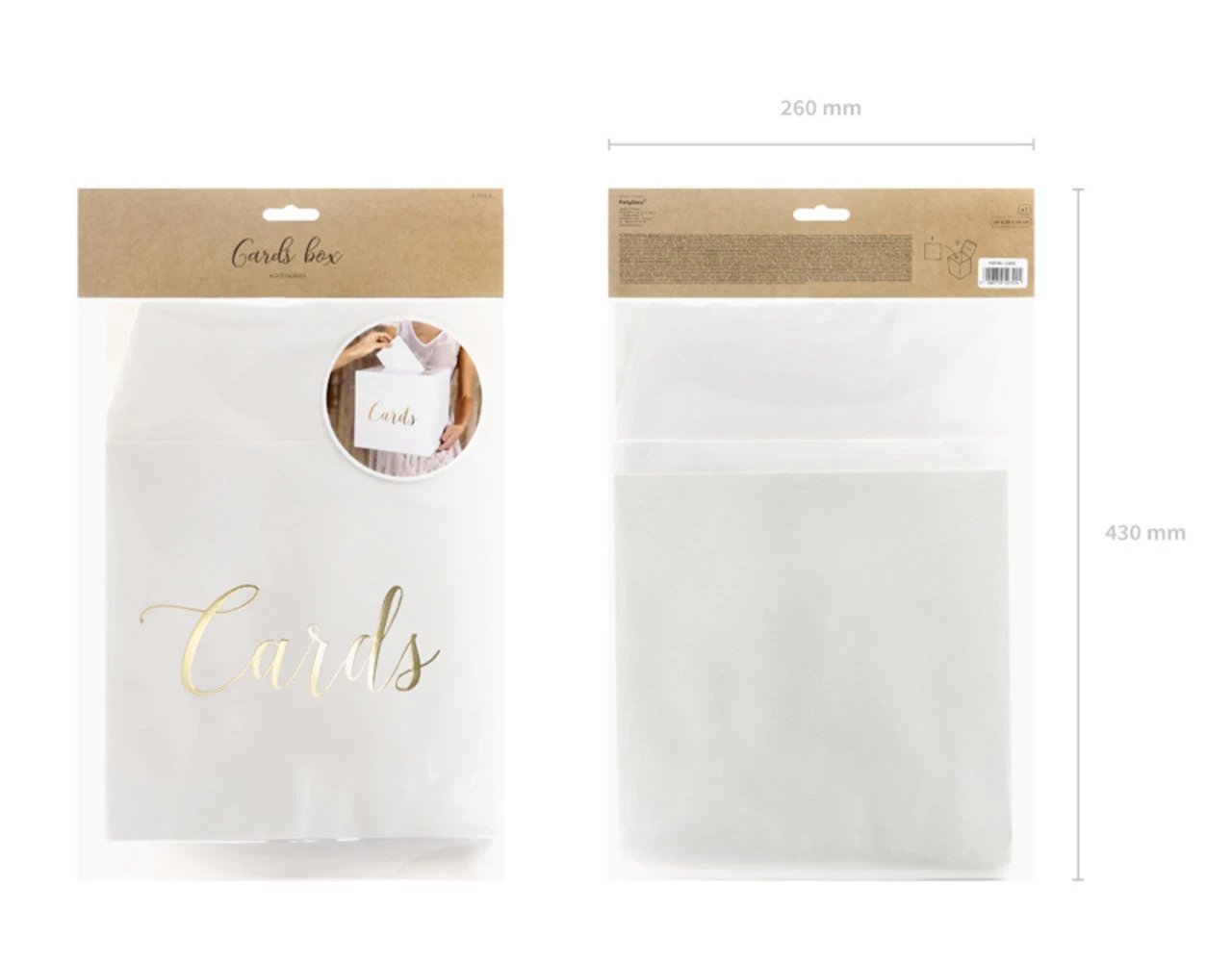 Trouwkaarten doosje van wit papier met metallic gouden opschrift Kaarten, afmeting na assemblage ca. 24 x 24 x 24 cm.