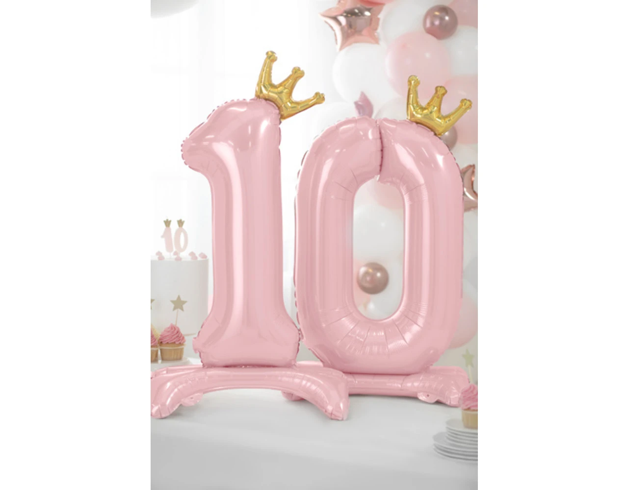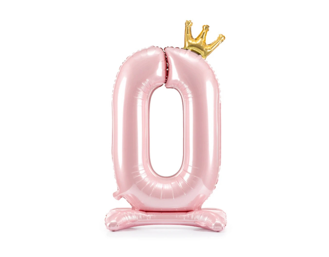 Staande, metallic folieballon Nummer ”0” in lichtroze kleur met een kroon in goudkleur, afmeting voor opblazen ca. 103 cm (40,5”), afmeting na opblazen 84 cm (33”). Opblazen met lucht.