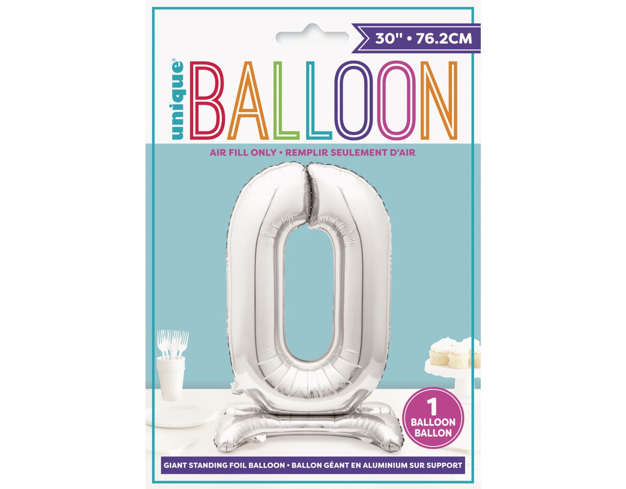 Verpakkingsinhoud: Folie Ballon Cijfer 0 Zilver met standaard 76cm