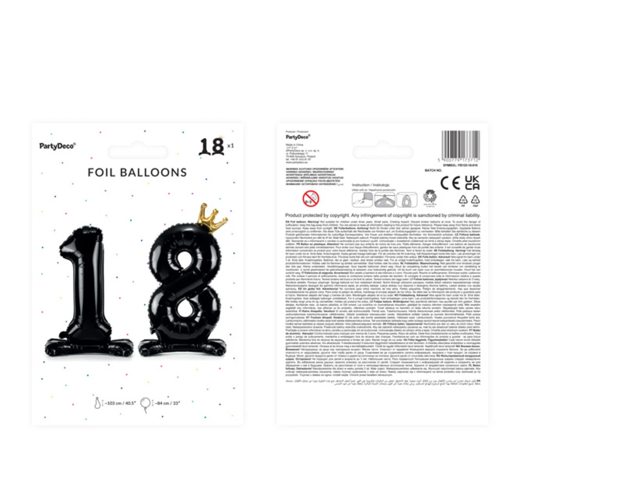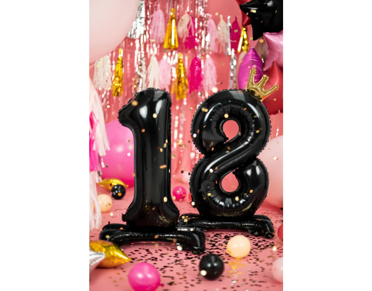 Staande folieballon Nummer ”18” in zwarte kleur met een kroon in goudkleur, afmeting voor opblazen ca. 103 cm (40,5”), afmeting na opblazen 84 cm (33”). Opblazen met lucht.