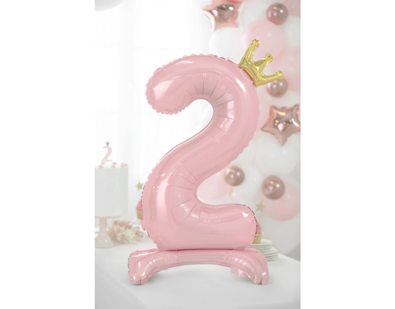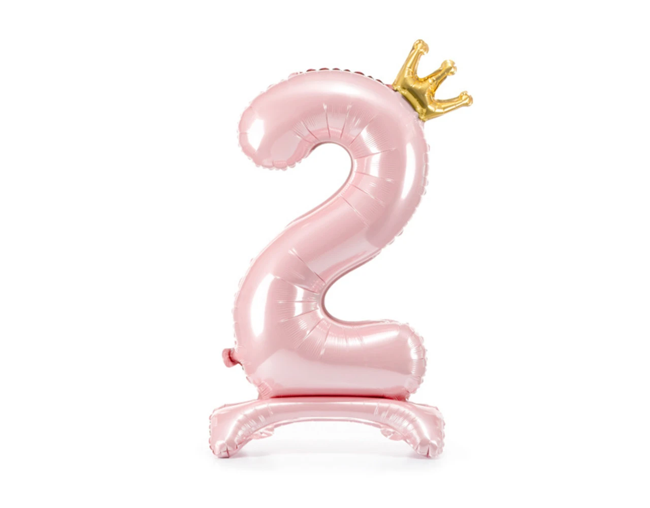 Staande, metallic folieballon Nummer ”2” in lichtroze kleur met een kroon in goudkleur, afmeting voor opblazen ca. 103 cm (40,5”), afmeting na opblazen 84 cm (33”). Opblazen met lucht.