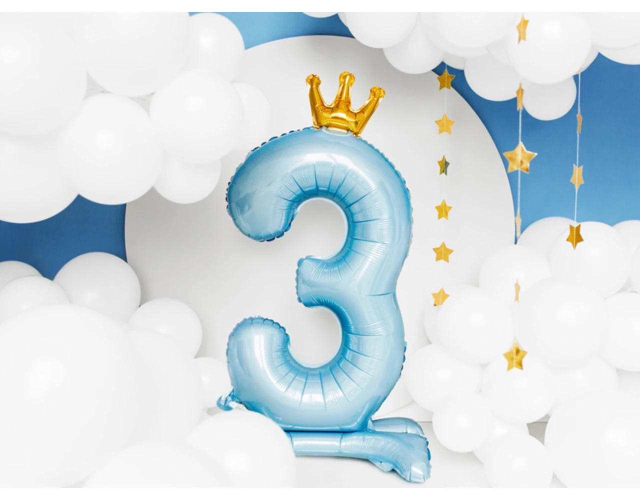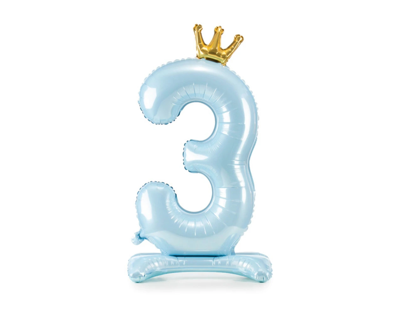 Staande, metallic folieballon Nummer ”3” in hemelsblauwe kleur met een kroon in goudkleur, afmeting voor opblazen ca. 103 cm (40,5”), afmeting na opblazen 84 cm (33”). Opblazen met lucht.