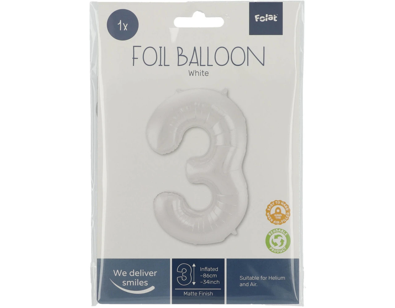 Folieballon Cijfer 3 Wit Metallic Mat – 86 cm. Inhoud: 1 folieballon. Kleur: Wit. Bijvoorbeeld te gebruiken tijdens de volgende feestgelegenheid/feestgelegenheden: Verjaardag, Kinderfeestje en Jubileum. Deze folieballon is 34 inch/86 cm. Het artikel is gemaakt van folie.