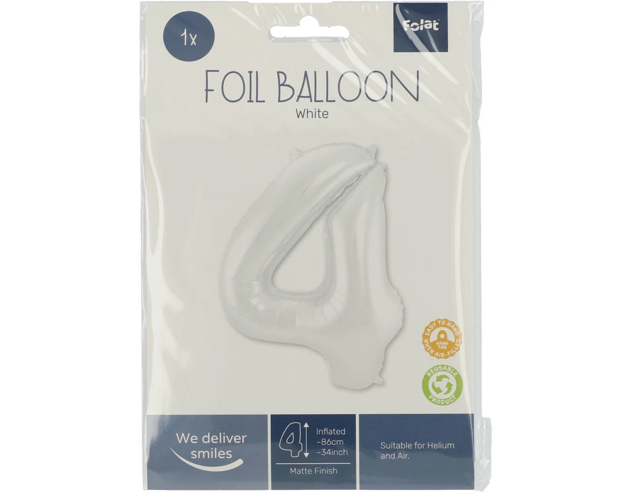 Folieballon Cijfer 4 Wit Metallic Mat – 86 cm. Inhoud: 1 folieballon. Kleur: Wit. Bijvoorbeeld te gebruiken tijdens de volgende feestgelegenheid/feestgelegenheden: Verjaardag, Kinderfeestje en Jubileum. Deze folieballon is 34 inch/86 cm. Het artikel is gemaakt van folie.