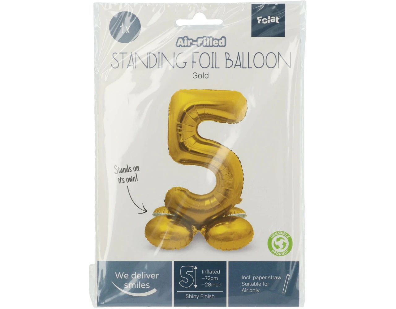 Staande Folieballon Cijfer 5 Goudkleurig – 72 cm. Inhoud: 1 folieballon. Kleur: Goudkleurig. Bijvoorbeeld te gebruiken tijdens de volgende feestgelegenheid/feestgelegenheden: Verjaardag, Kinderfeestje en Jubileum. Deze folieballon is 28 inch/72 cm en kan gevuld worden met lucht (geen helium nodig). Het artikel is gemaakt van folie.
