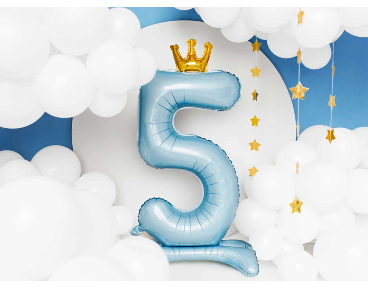 Staande, metallic folieballon Nummer ”5” in hemelsblauwe kleur met een kroon in goudkleur, afmeting voor opblazen ca. 103 cm (40,5”), afmeting na opblazen 84 cm (33”). Opblazen met lucht.
