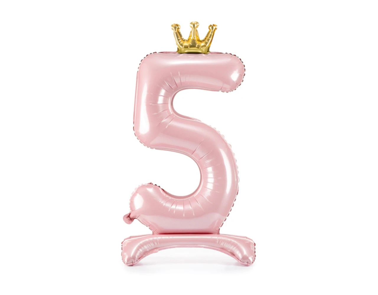 Staande, metallic folieballon Nummer ”5” in lichtroze kleur met een kroon in goudkleur, afmeting voor opblazen ca. 103 cm (40,5”), afmeting na opblazen 84 cm (33”). Opblazen met lucht.