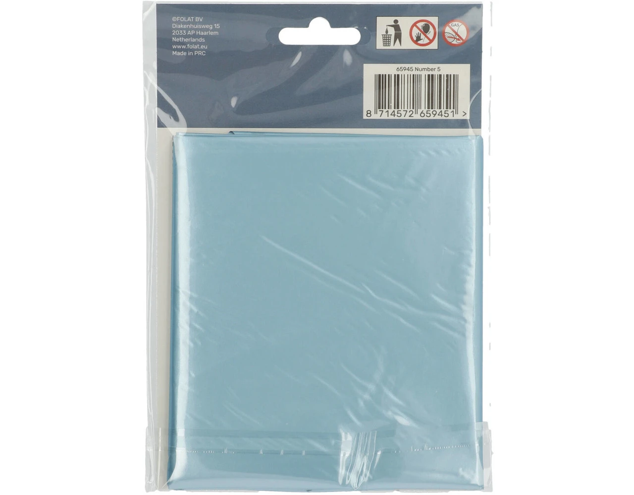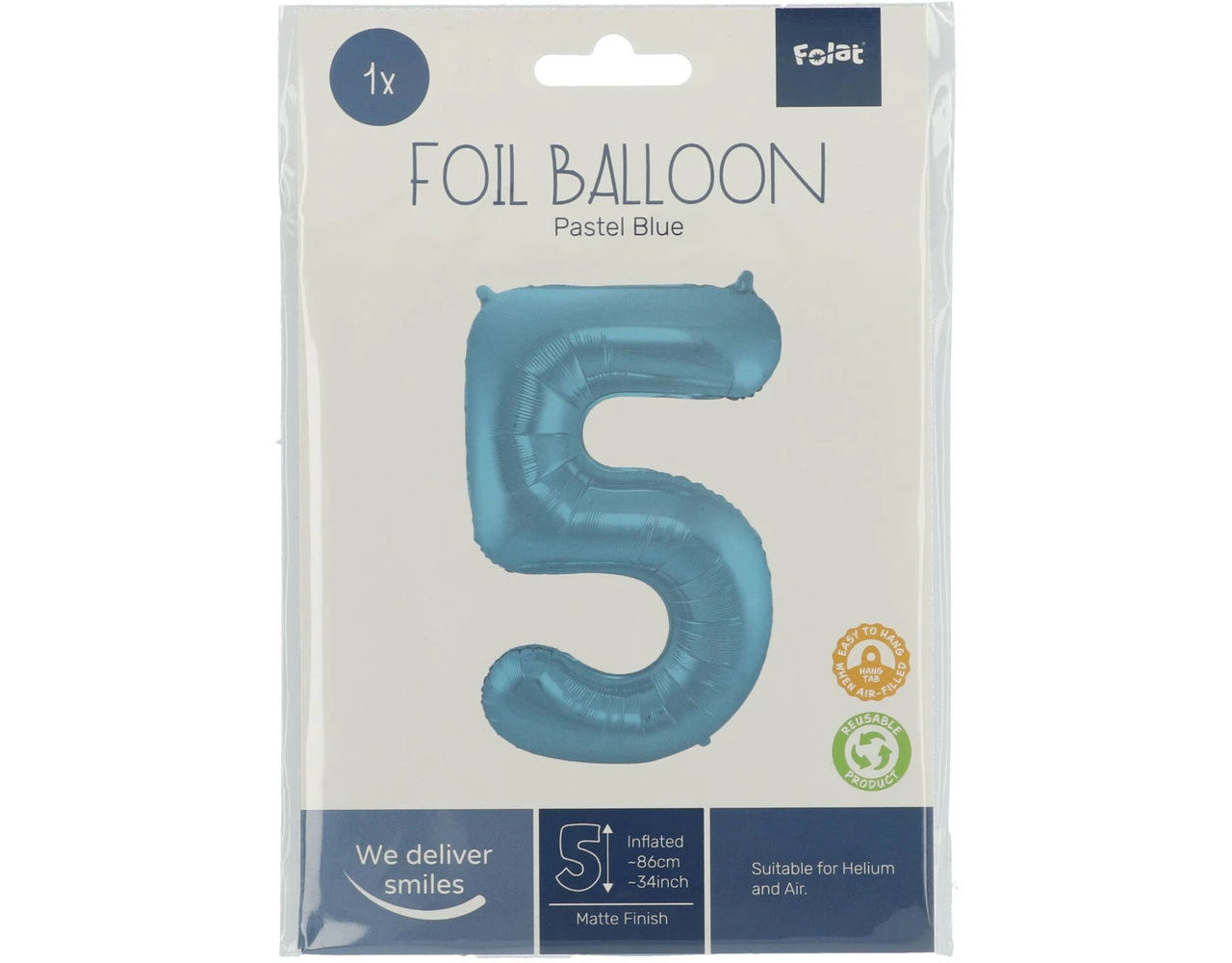 Folieballon Cijfer 5 Pastel Blauw Metallic Mat – 86 cm. Inhoud: 1 folieballon. Kleur: Blauw. Bijvoorbeeld te gebruiken tijdens de volgende feestgelegenheid/feestgelegenheden: Verjaardag, Kinderfeestje en Jubileum. Deze folieballon is 34 inch/86 cm. Het artikel is gemaakt van folie.