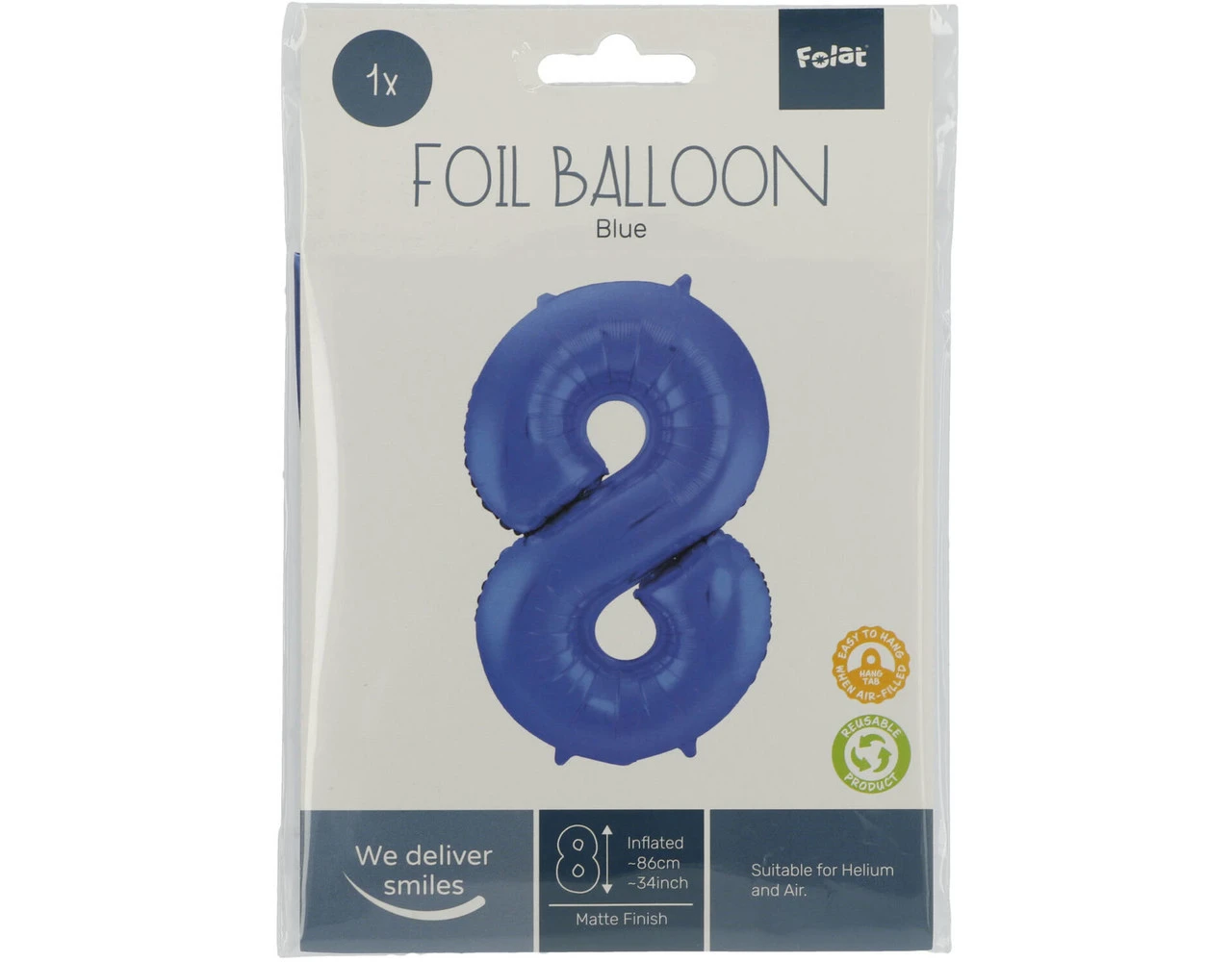 Mooie grote folieballon van het cijfer 8 in een metallic mat blauwe kleur. Inhoud: 1 folieballon van 86cm. Kleur: Blauw. De ballon komt met handige ophang tabs, zodat hij makkelijk opgehangen kan worden. Bijvoorbeeld te gebruiken tijdens de volgende feestgelegenheid/feestgelegenheden: Verjaardag, Kinderfeestje en Jubileum. Deze folieballon is 34 inch/86 cm. Het artikel is gemaakt van folie.